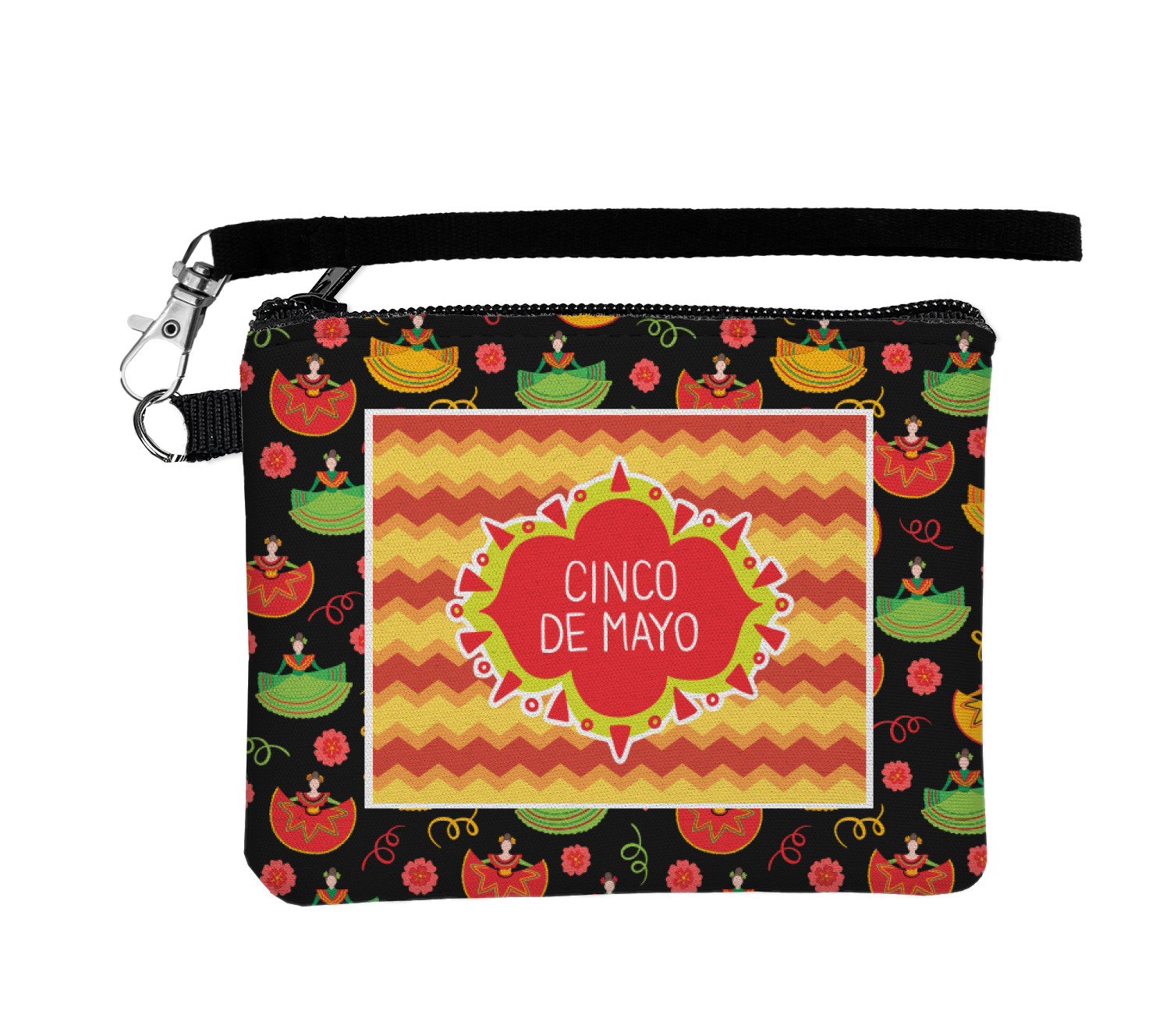 The design has two layers, one inside the other. The inner layer is a fun orange and red chevron. The outer layer has illustrated ladies wearing traditional Mexican skirts with flowers and confetti all around them. The background of this pattern is black, which really makes the bright colors of this pattern stand out. In the very middle of the design is a fun frame with the words "Cinco de Mayo" written inside.