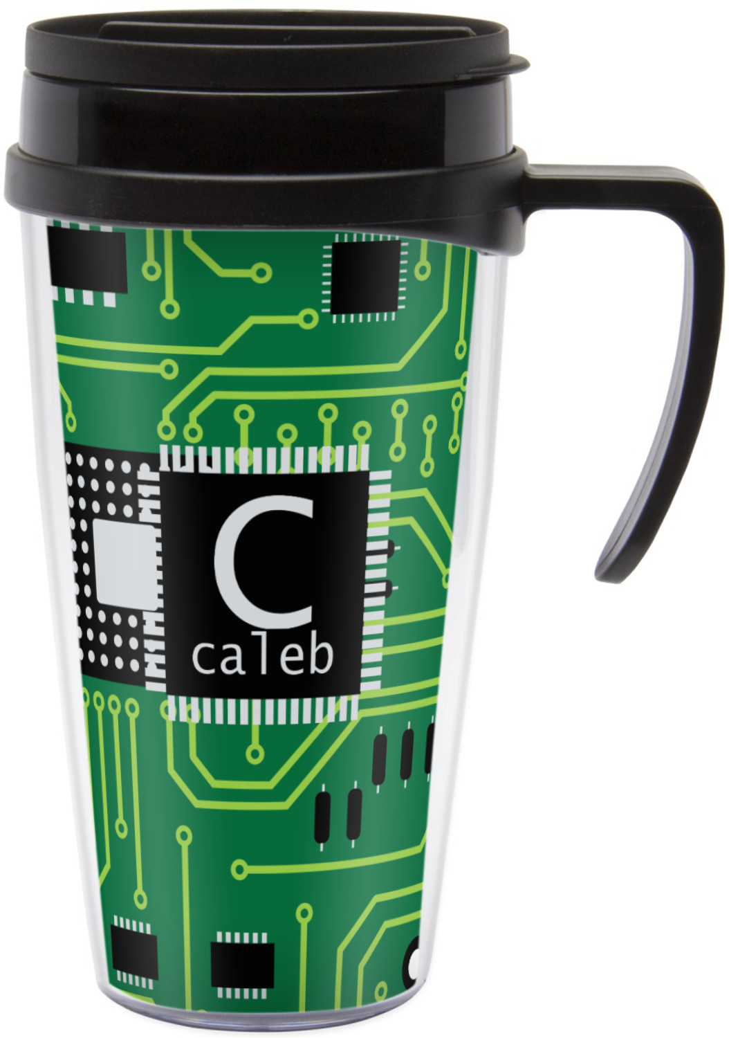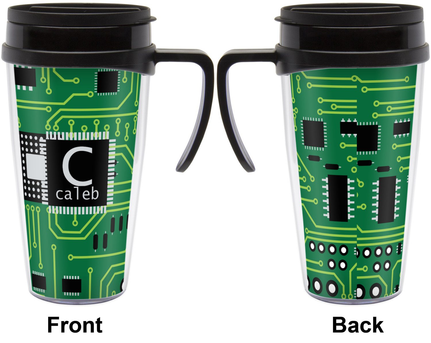 These thermal mugs are free of BPA, and insulated, to keep your drinks hot or cold. The black, snap on lid and the slider for sipping allows you to conveniently sip your drink without constantly worrying about a disastrous spill. We offer this mug with and without a handle, to better suit your needs. Each custom thermal mug holds up to 16 ounces of liquid and displays your customization on all sides on premium gloss media inserts.