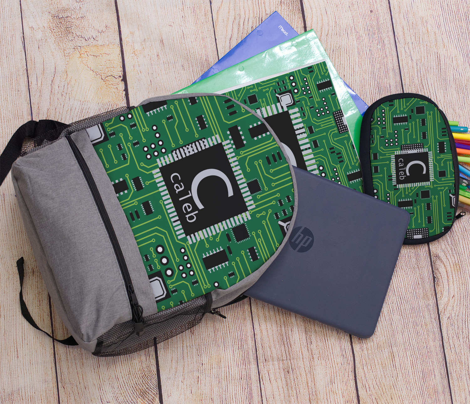 This circuit board design is perfect for the geek in your life. It was designed for the geeks at our workplace who complained that there we did not have any designs for them. Now Caleb sports around a trifold wallet and a clip board in this design!