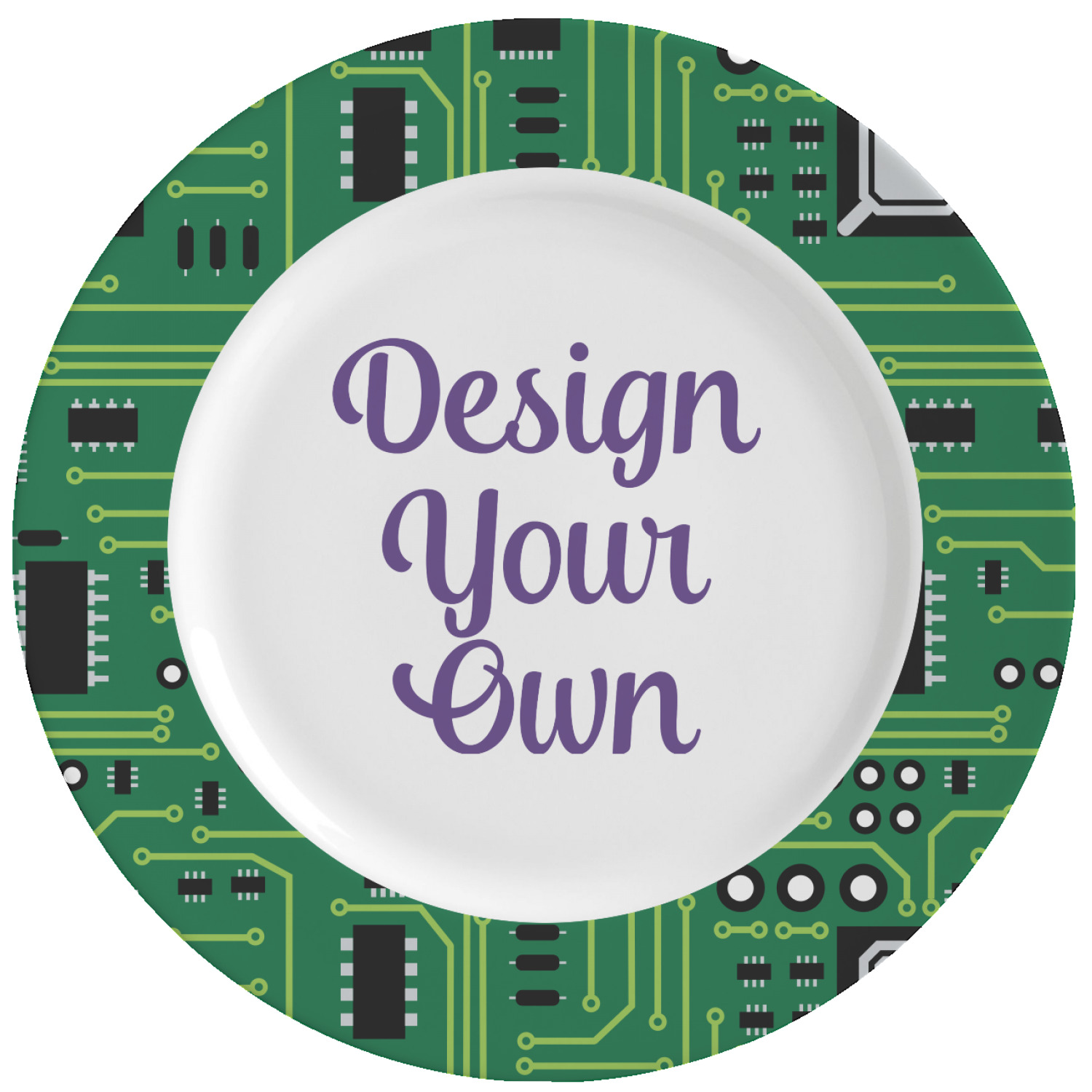 With this custom dinner plate, your have the option of personalizing the rim with an attractive pattern, and then displaying a name, graphic, or text in the center of the plate, against a white background. The exterior of this plate is also the same classic, white color. A glaze coats your plate, making your vividly colored design seem even more vibrant.