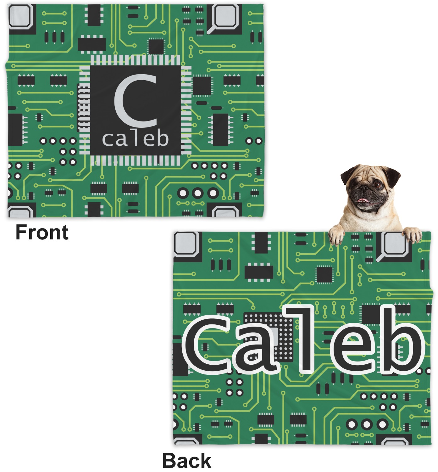 These dog blankets are crafted from a gentle, soft-to-the-touch, minky material. We print your customizations, either matching or differing, on both the top and underside of the blanket. These personalized dog blankets are available in two sizes: regular and large. Our regular size, at 40" x 30", accommodates small and some medium size dogs. At 60" x 50", our large dog blanket is a better fit for bigger breeds. Though specialized for dogs, these blankets still make a thoughtful gift for your favorite feline, or any other pet in mind!