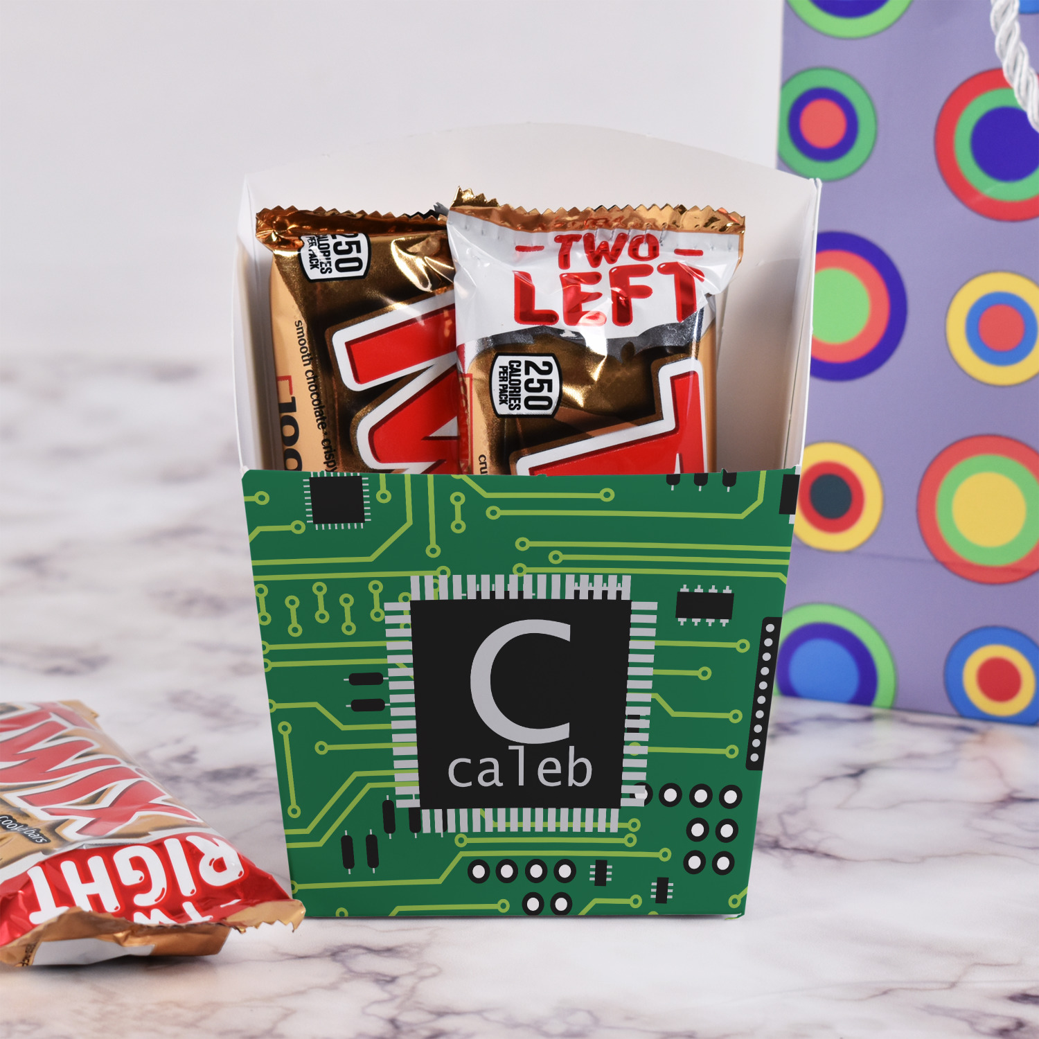 Since it is an open box, it works very well as a party snack cup (instead of plates) for different types of dry snacks and treats such as popcorn, cheezies, pretzels, chips, twizzlers, etc. This box can easily be carried with a drink all in one hand!
