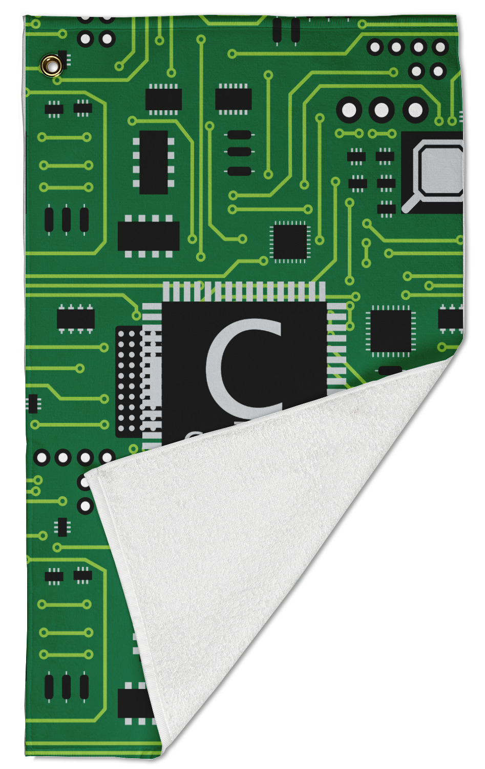 The towel is fully printed / patterned on the front polyester side; and is white on terrycloth cotton backside. The towel has grommet and a pear spring clip in the top left corner. Our golf towels are available in 100s of different prints and patterns.
