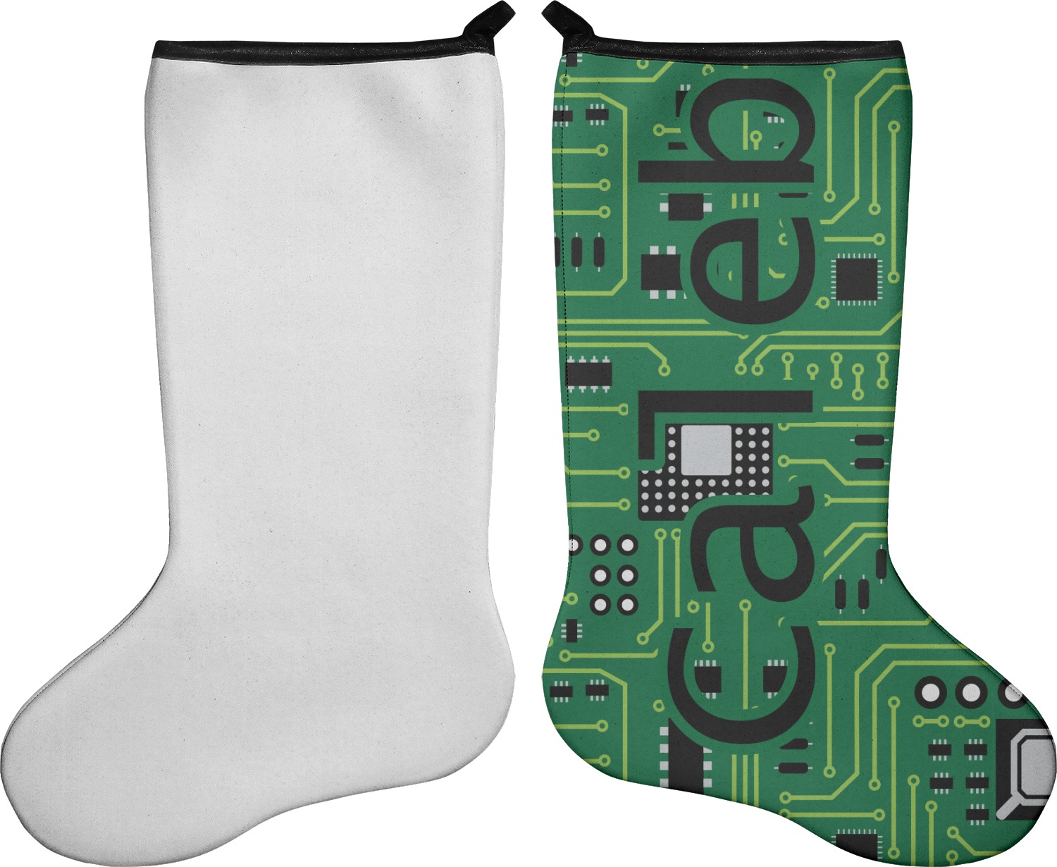 These 17" x 11" stockings are made of neoprene and have a black trim to give them a fantastic finished look. Your very own design is printed right onto the stocking, either single sided with white on the back or double sided where can use the same or different designs / patterns on the front and the back - the choice is yours. At the top of the stocking is a 2" loop for hanging.