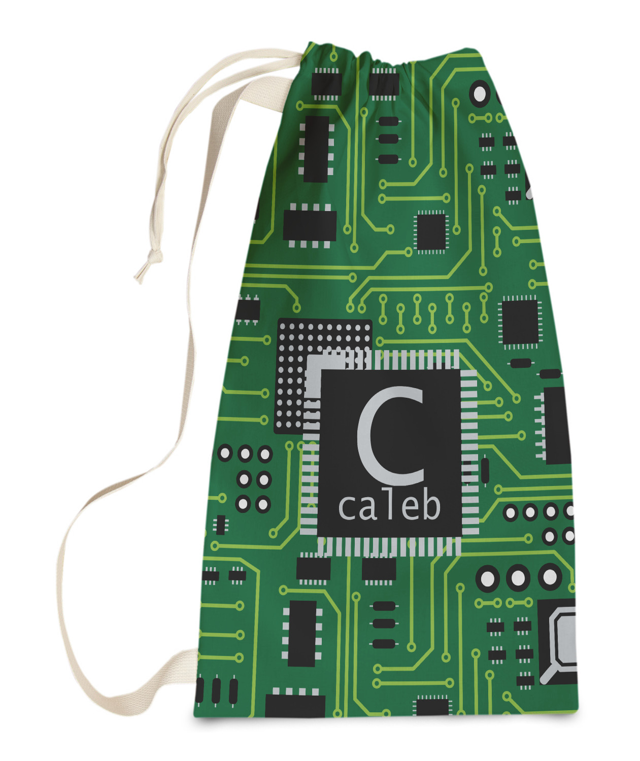 Carry your laundry in style with these customized laundry bags. Available in two sizes, featuring a natural colored woven strap and a cinch cord, these bags hold a lot of clothes or anything else you want to fit in them.