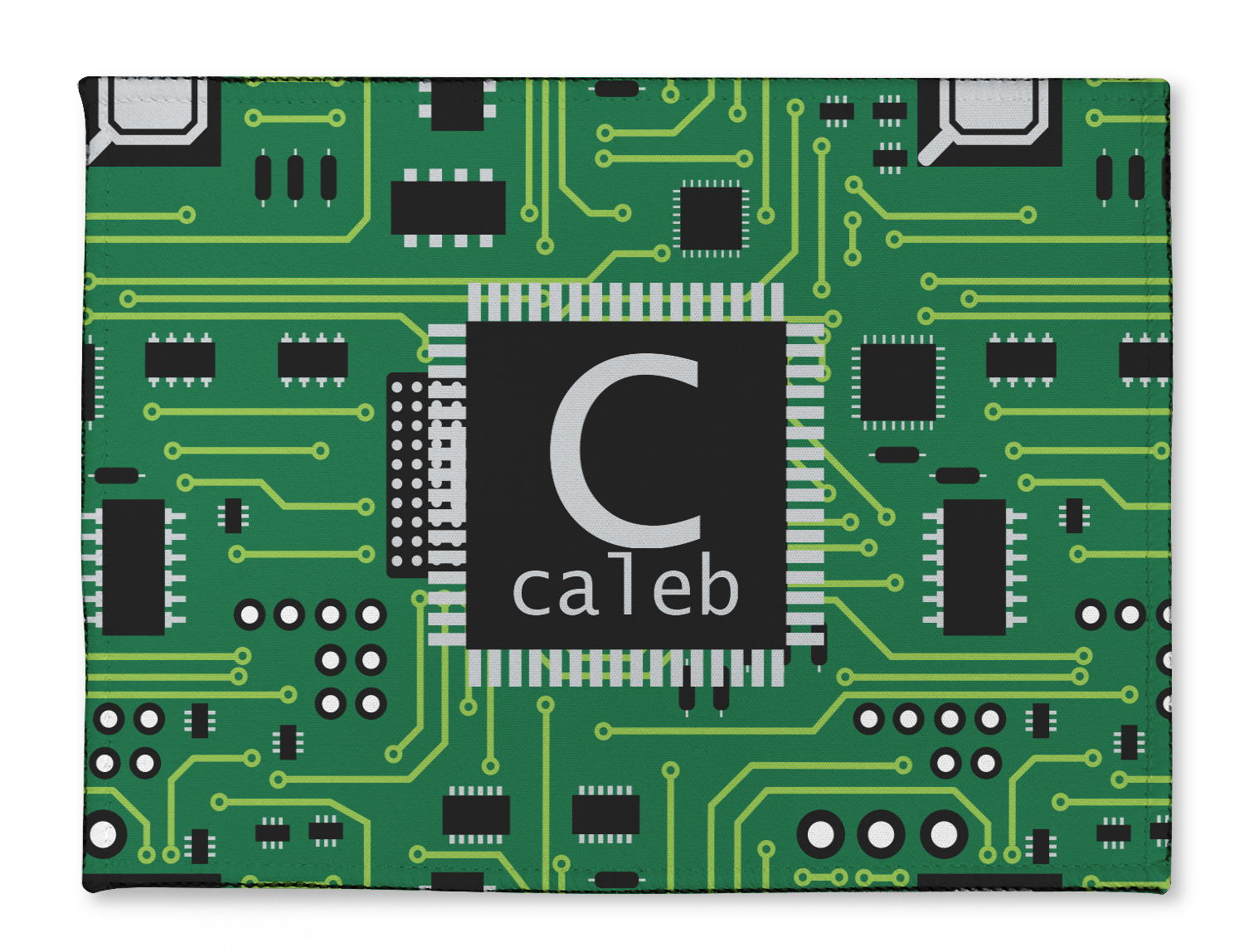 This circuit board design is perfect for the geek in your life. It was designed for the geeks at our workplace who complained that there we did not have any designs for them. Now Caleb sports around a trifold wallet and a clip board in this design!