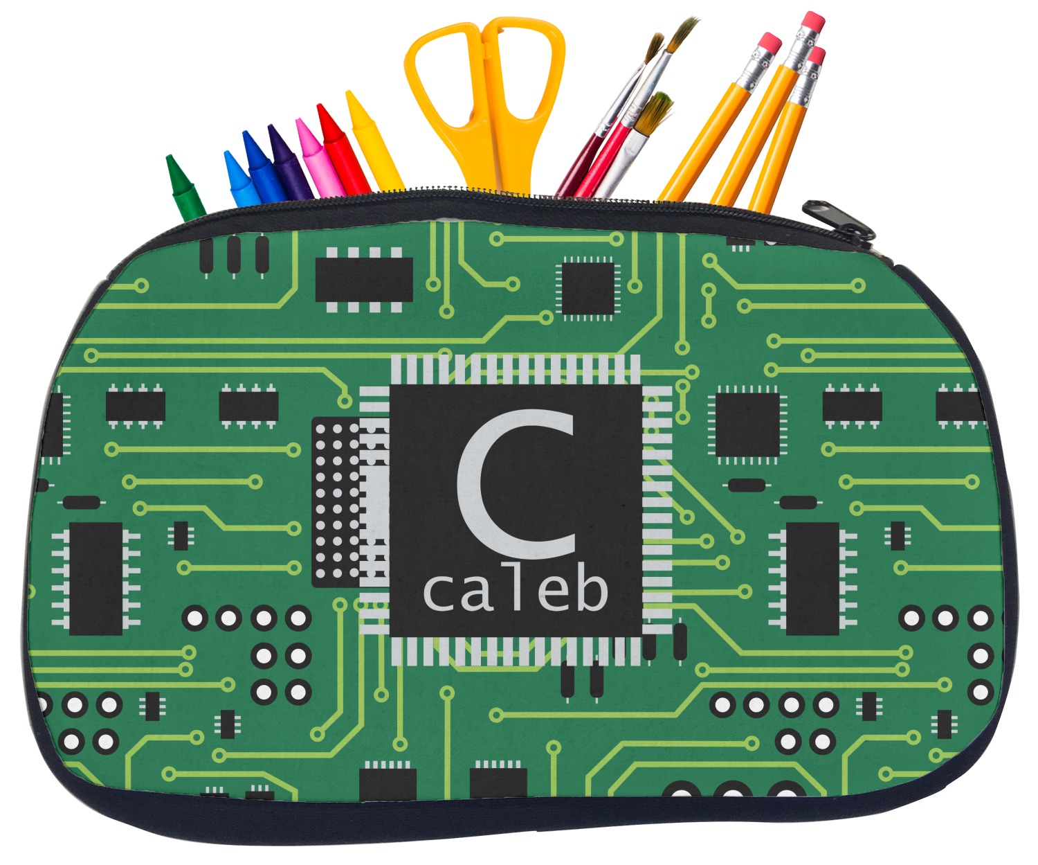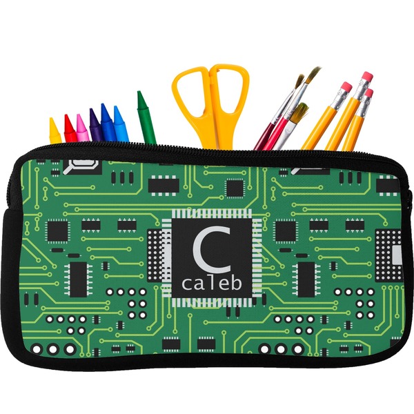 Built from durable neoprene, these pencil pouches, are water resistant, and prevent leaking ink from spilling into your backpack or purse. These custom pencil cases secure with a robust, black zipper. We print your personalized design on the front of this pouch, while the remaining sides a simple black color. These colored pencil cases [880] are sold in two sizes; our smaller version measures at 8.5 by 4.5 inches, while the medium measures at 10.5 by 6.5 inches. The smaller size is more suitable for holding pencils and pens, while our medium size can accommodate pencil sharpeners, scissors, and erasers.