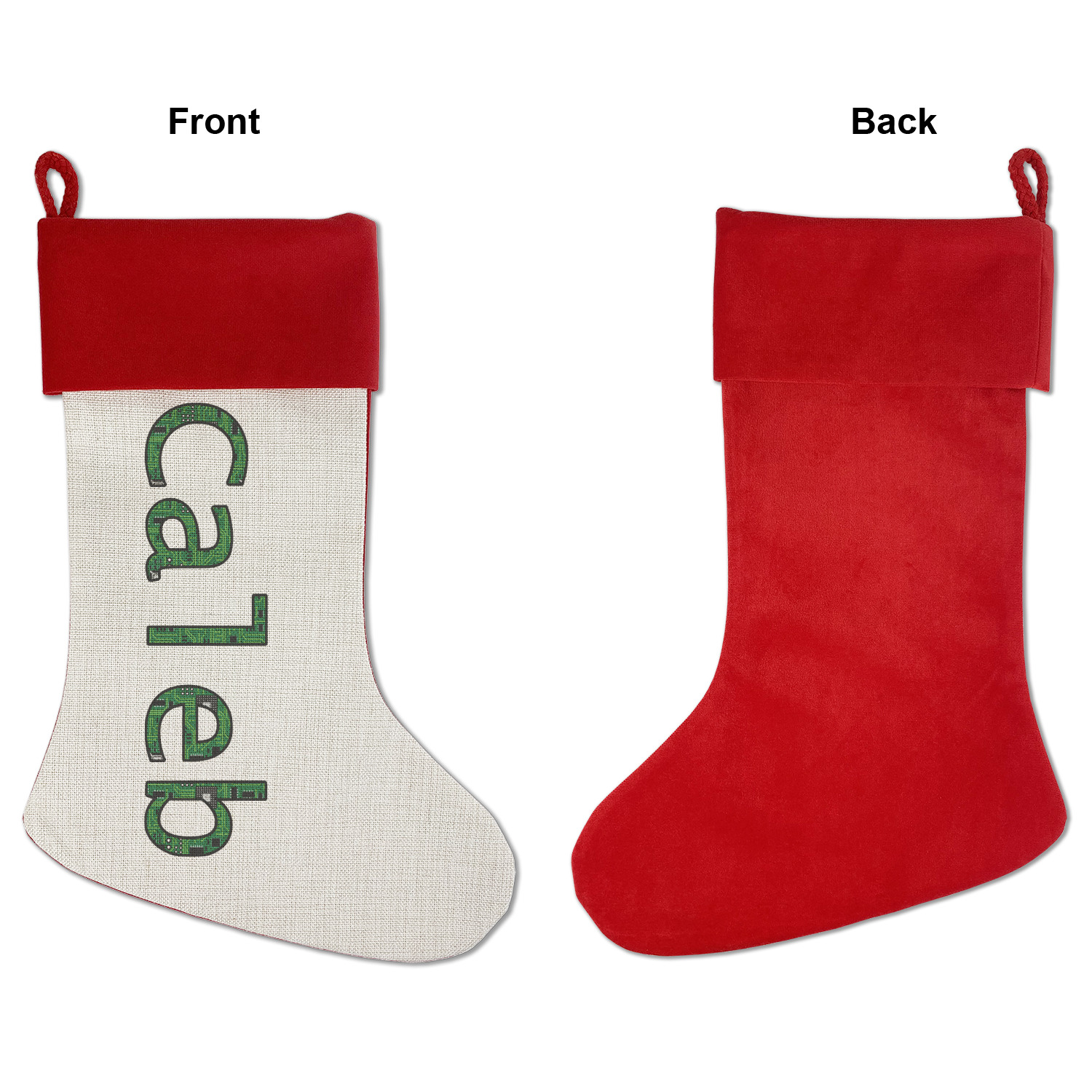 Our classic red stockings are made from a soft, yet durable polyester material perfect for any stocking stuffer! The front of our Christmas stockings have a linen front that boldly displays your custom design accented with a lush red cuff resting all around the stocking. Each stocking is approximately 18x12 with a durable cotton rope loop for hanging.
