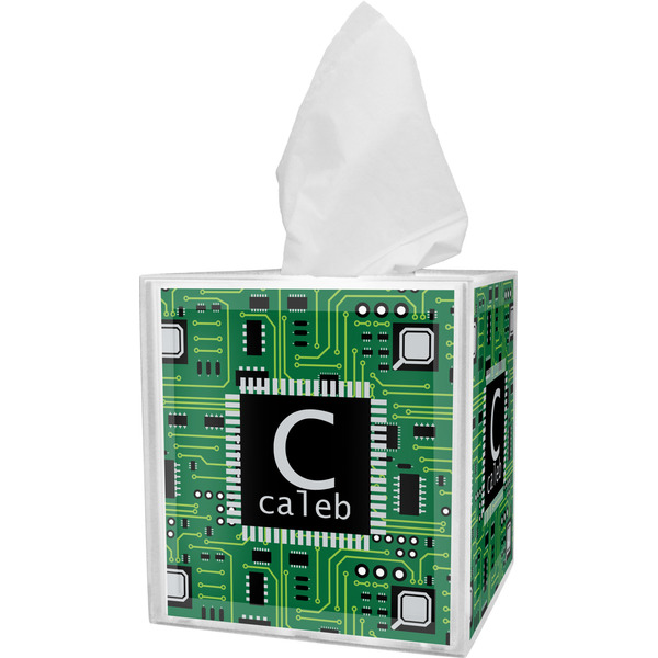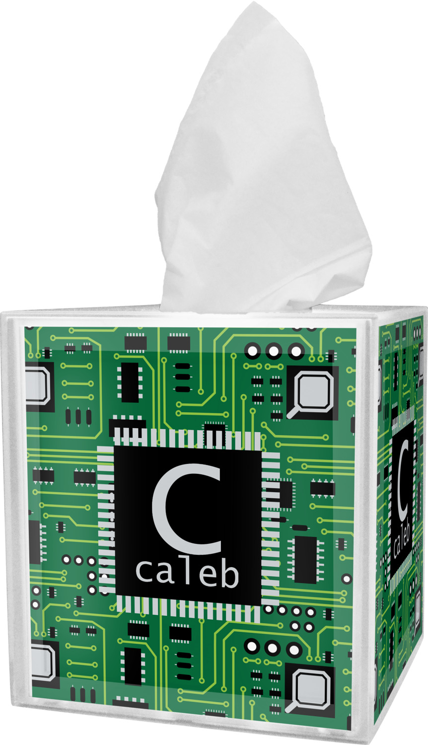 These tissue holders are built from durable acrylic and display your unique personalization on fine-quality vinyl inserts placed within the four sides and top. The box features two pieces, allowing you to easily switch out tissue boxes. On the sides, youll find ridges that ensure the top and base fit securely in place. The bottom of these tissue box holders has four, rubber, non-slip pads to prevent the box from scuffing any surface you decide to display it on. Each box can fit a standard 5 by 5-inch box of tissues.