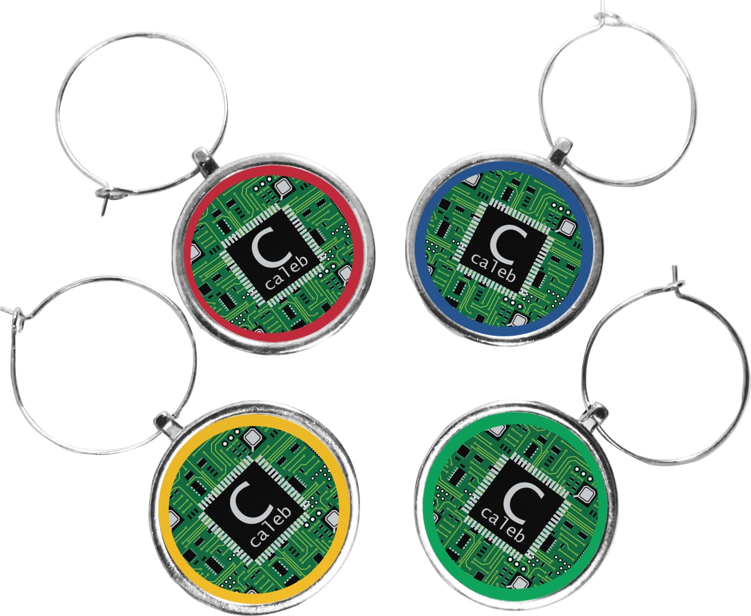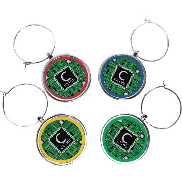 Your wine glass markers are comprised of a circular zinc plate with a 1.25 inch diameter. The zinc plate hangs from a zinc loop, which can be easily secured and removed from the stem of a wine glass. Your customized design is printed onto a 1 inch diameter insert, and then placed into the wine glass charm itself. Though sold in a set of four, you can personalize each charm individually and change the colors of the ring around your design, depending on your needs.