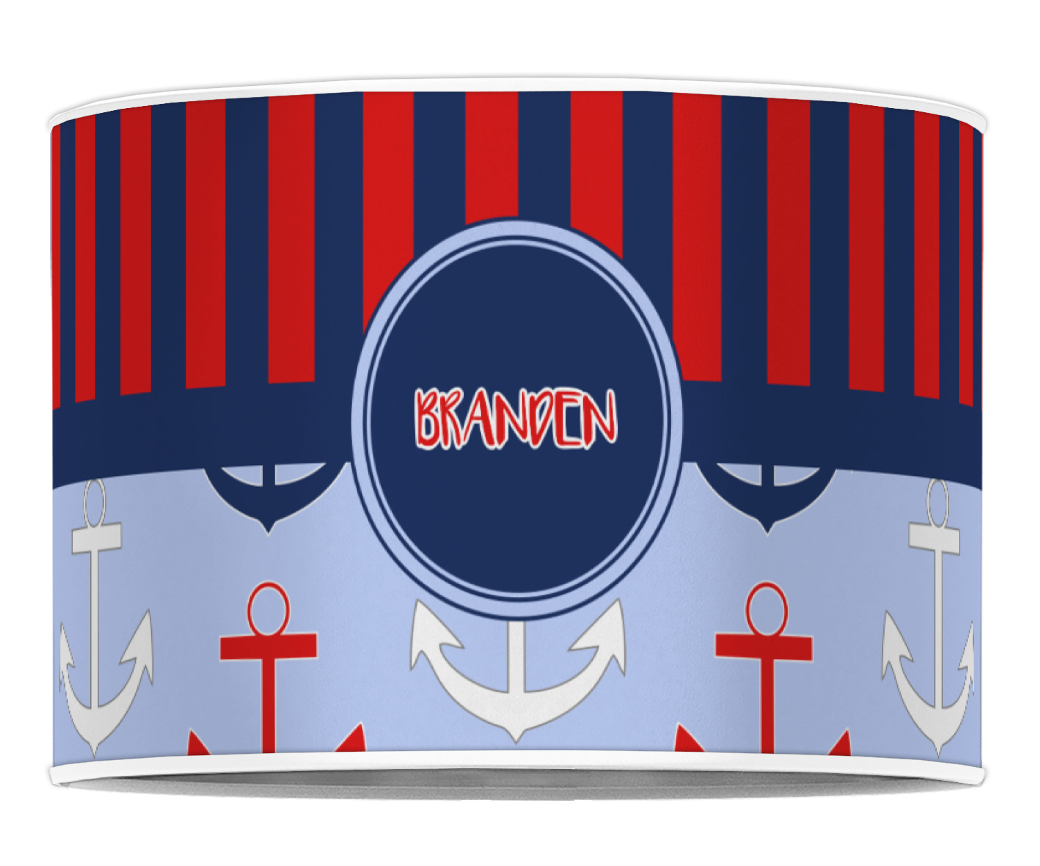This anchor & stripes pattern is a classic nautical including the colors. We chose the classic nautical red and navy blue striped on top, with anchors in red, white and blue on the bottom. We chose a solid navy ribbon along with a circle label and personalized it with a name.