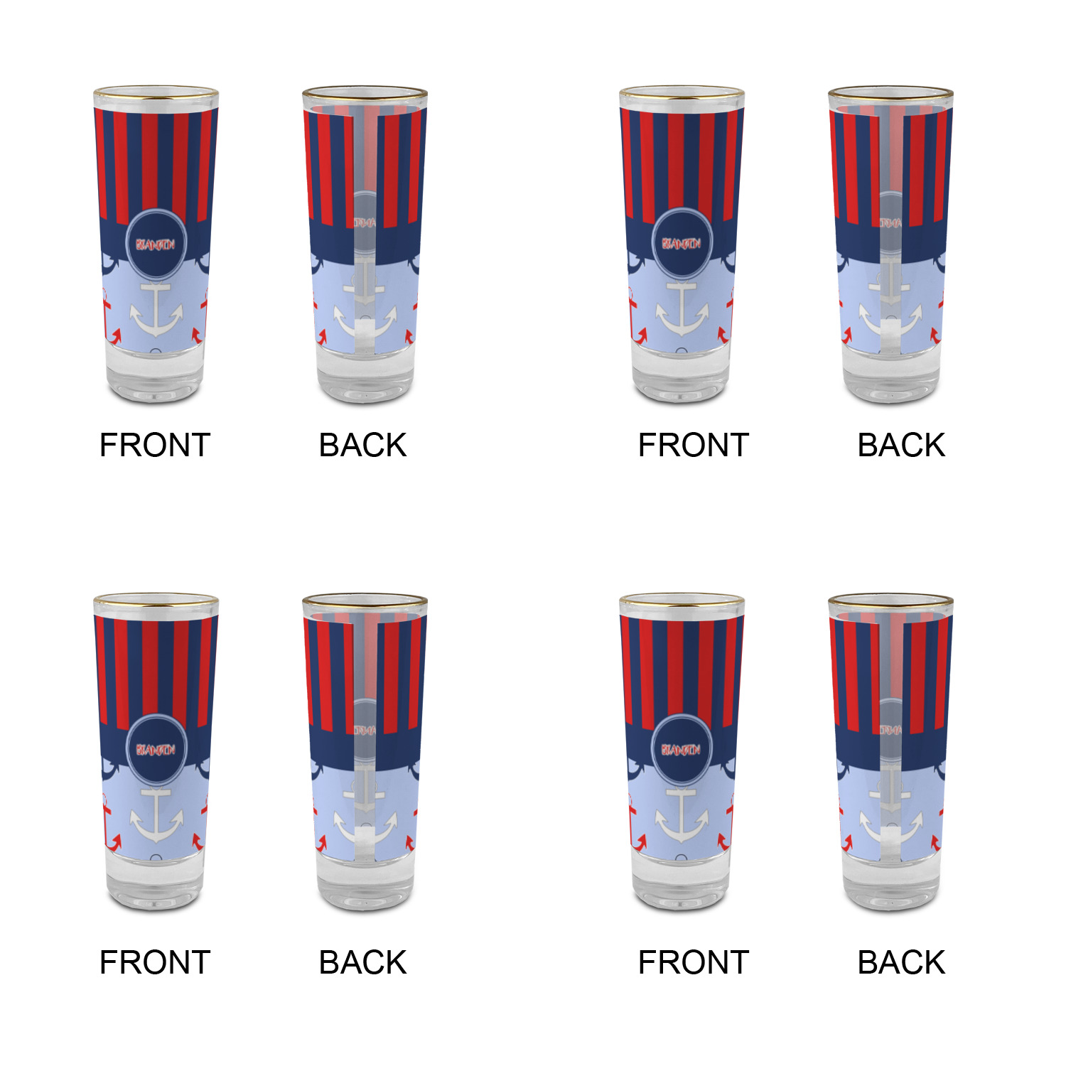 These glass shooter glasses are printed in full color with the design of your choice. These are a tall shooter 2 oz size and stand 4" tall. The print is a full wrap design to boldly display your personalization.