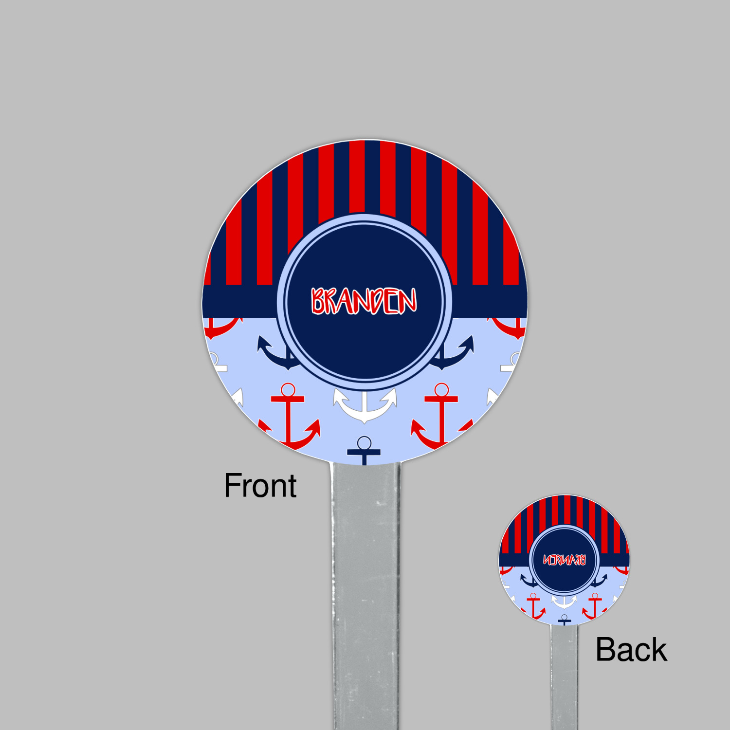 This anchor & stripes pattern is a classic nautical including the colors. We chose the classic nautical red and navy blue striped on top, with anchors in red, white and blue on the bottom. We chose a solid navy ribbon along with a circle label and personalized it with a name.
