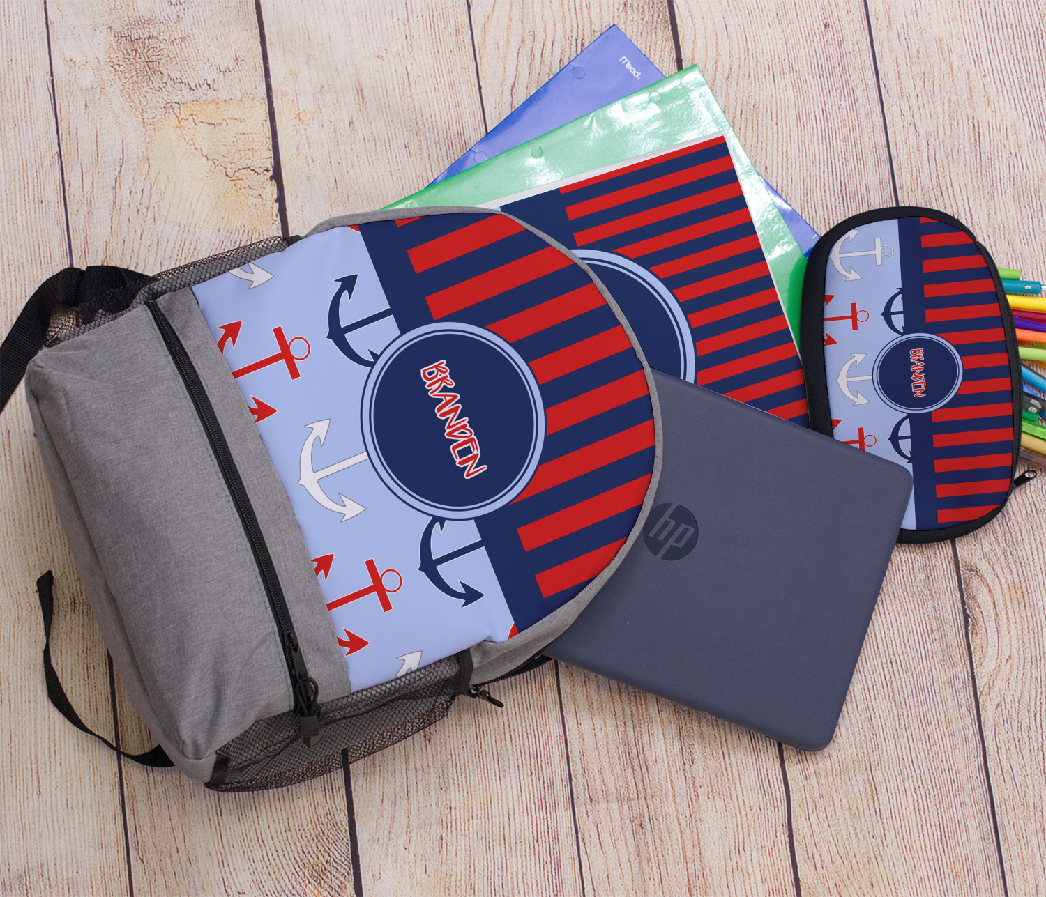 This anchor & stripes pattern is a classic nautical including the colors. We chose the classic nautical red and navy blue striped on top, with anchors in red, white and blue on the bottom. We chose a solid navy ribbon along with a circle label and personalized it with a name.