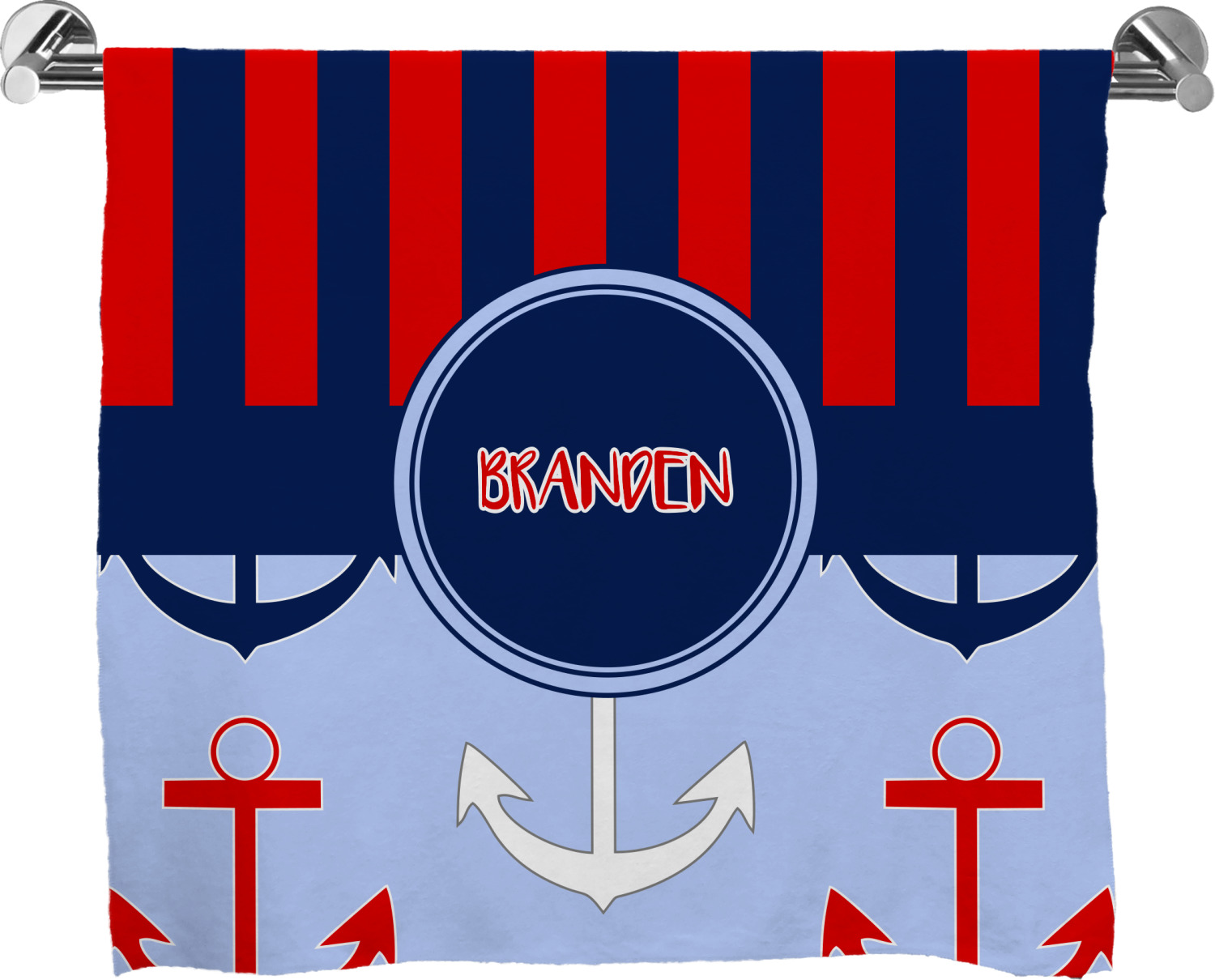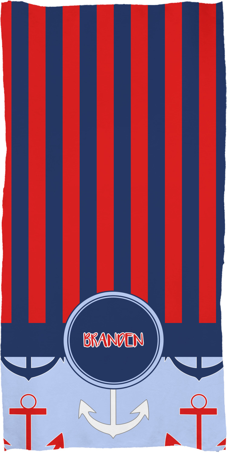 These customized bath towels are slightly larger than your standard towel and are the ideal size for wrapping around your body. They measure approximately 60" x 30". Your customization is displayed across the entire front face of the towel, while the back is white.