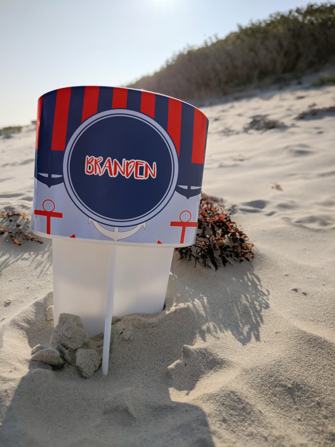 This cup holder has a large stake at its bottom that anchors it to the sand or ground below, while the cup holder rests above the stake. The entire drink holder is made of durable plastic and displays your customization around the cup holder portion. We sell these personalized beach spikers in two different colors: black and white.