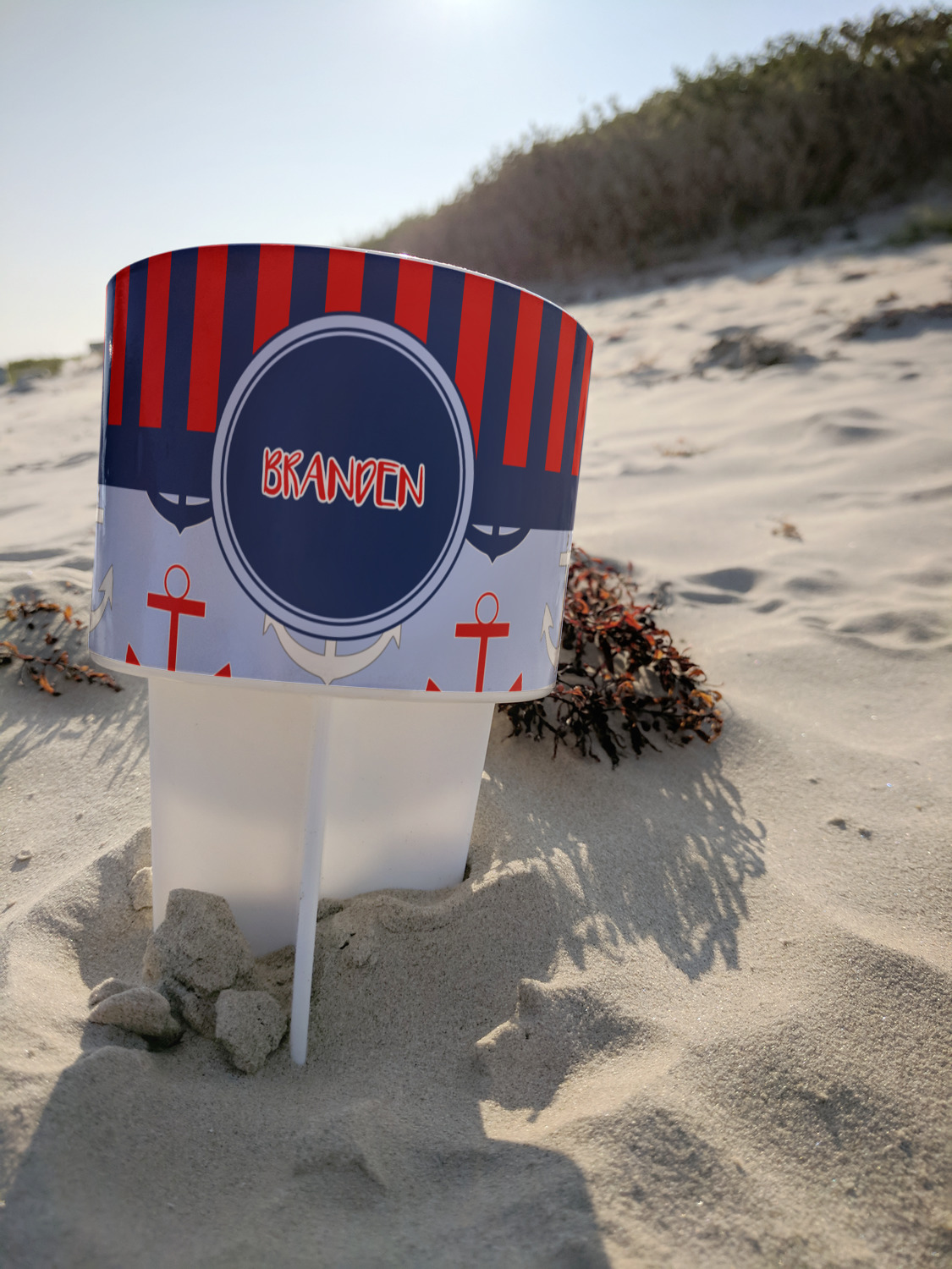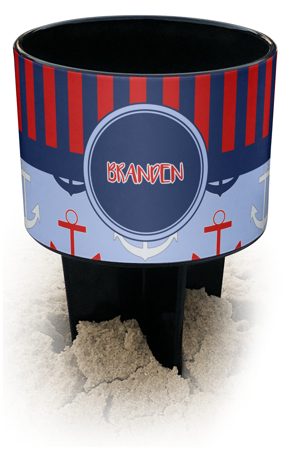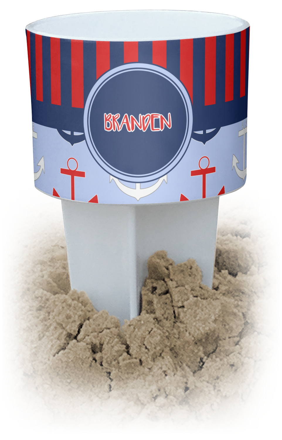 This cup holder has a large stake at its bottom that anchors it to the sand or ground below, while the cup holder rests above the stake. The entire drink holder is made of durable plastic and displays your customization around the cup holder portion. We sell these personalized beach spikers in two different colors: black and white.