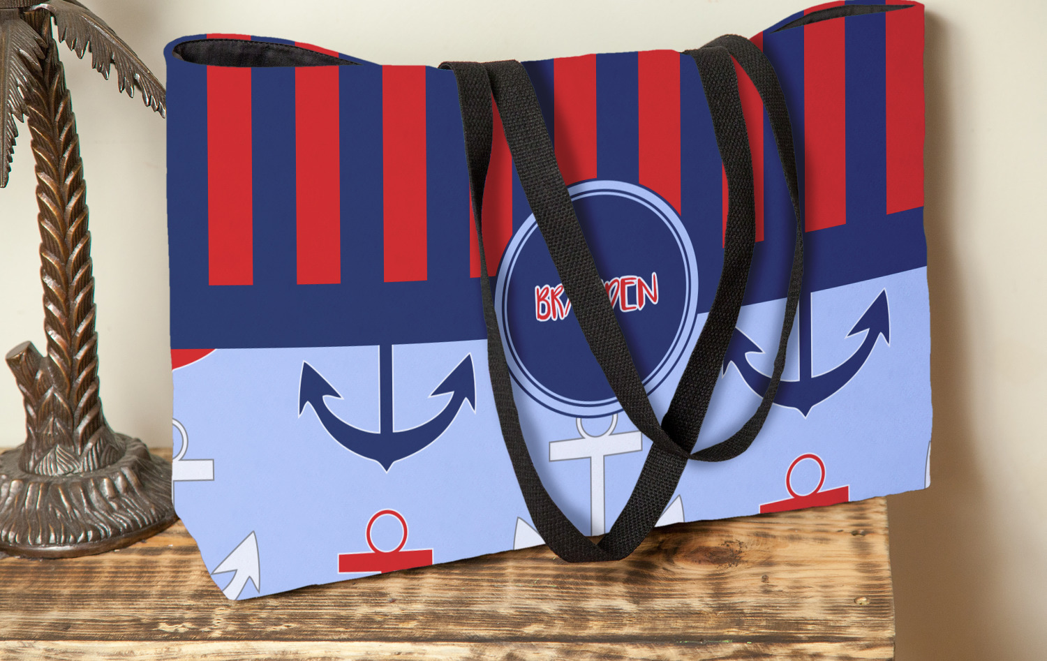 The totes are made from a sturdy canvas material on the outside and are lined with a black poly cotton lining. The beach totes have an approx. 28" black woven handles.