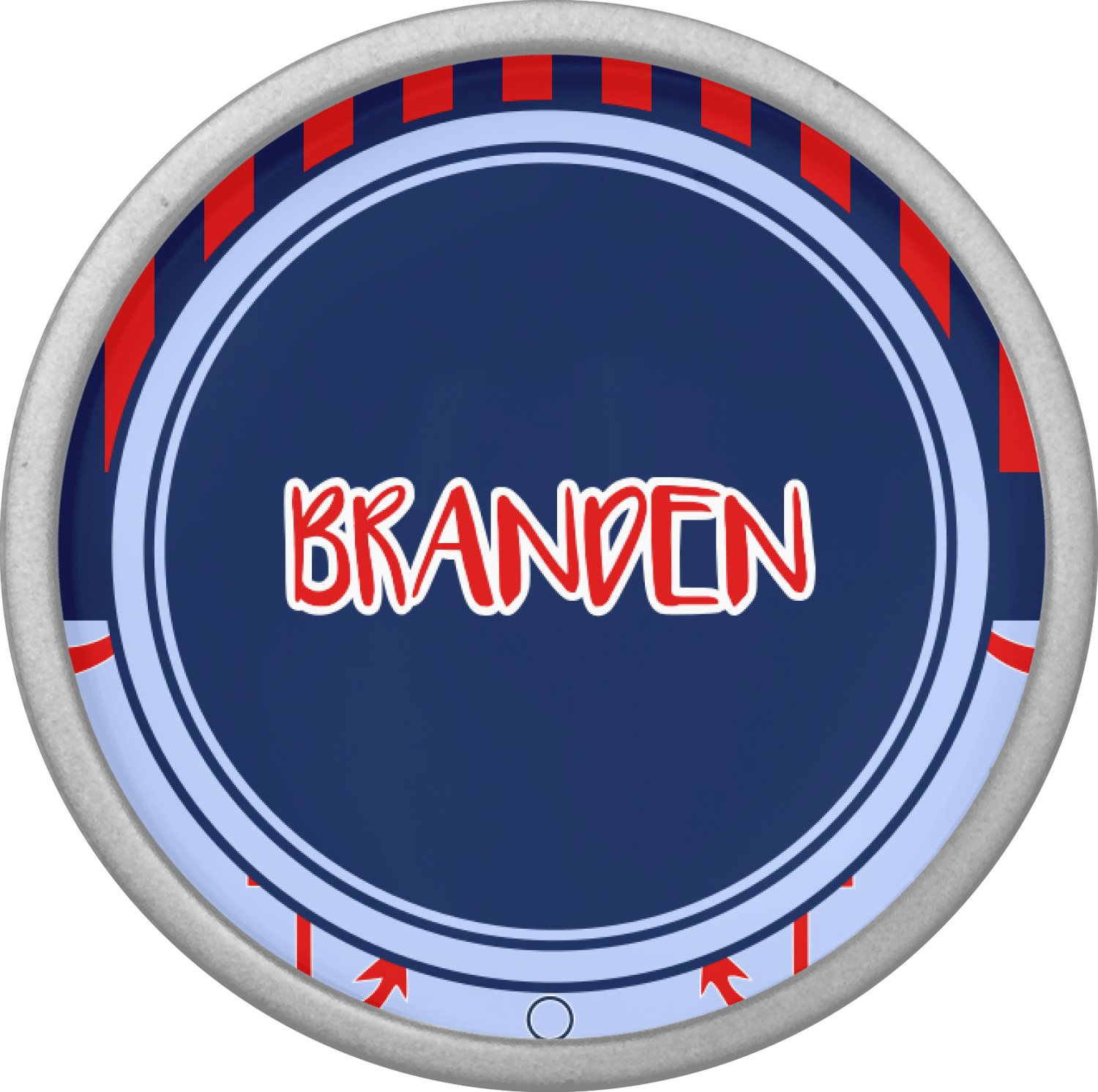 This anchor & stripes pattern is a classic nautical including the colors. We chose the classic nautical red and navy blue striped on top, with anchors in red, white and blue on the bottom. We chose a solid navy ribbon along with a circle label and personalized it with a name.
