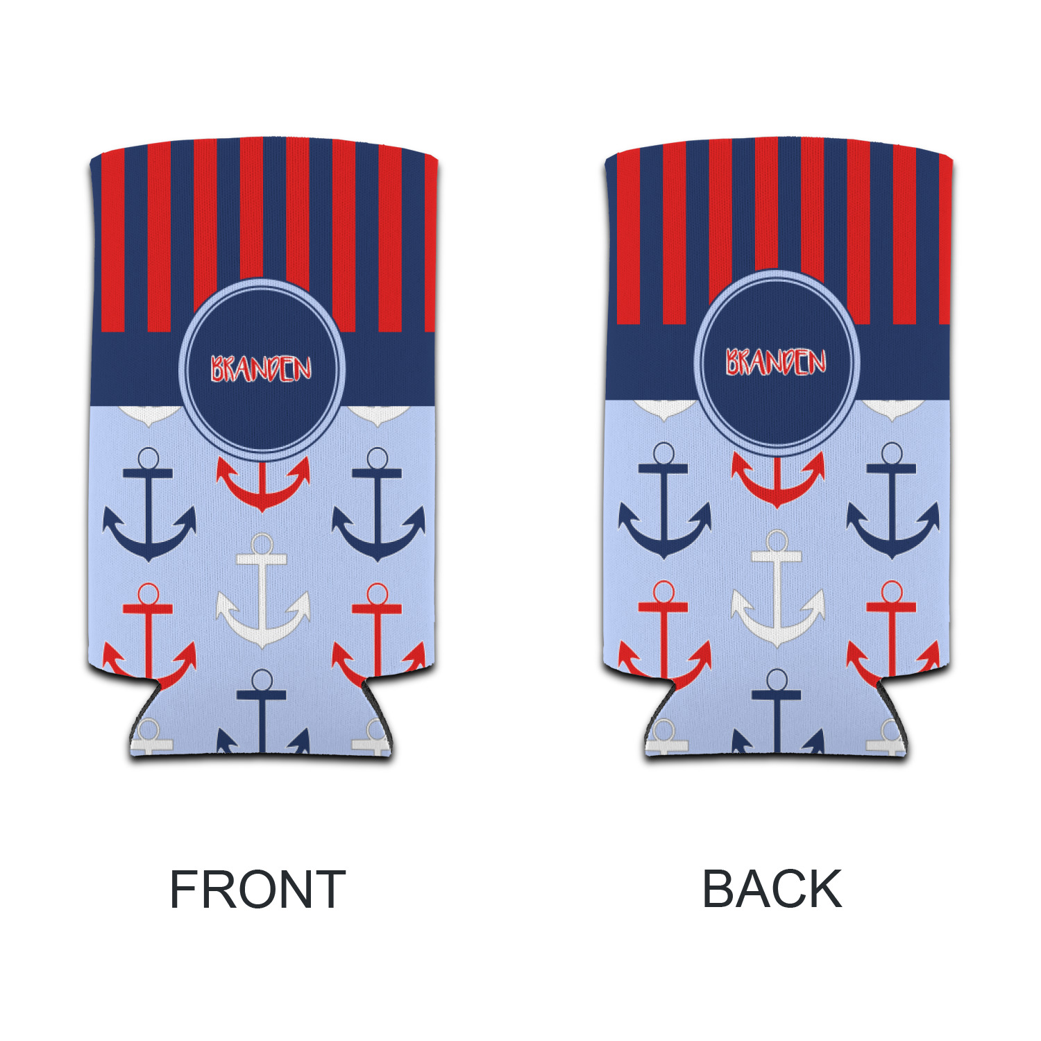 This anchor & stripes pattern is a classic nautical including the colors. We chose the classic nautical red and navy blue striped on top, with anchors in red, white and blue on the bottom. We chose a solid navy ribbon along with a circle label and personalized it with a name.