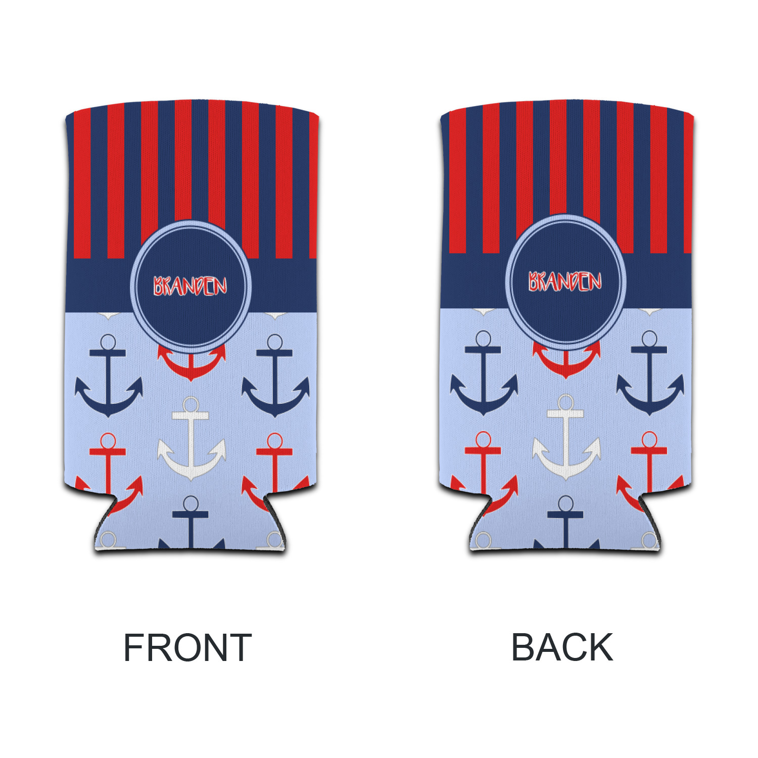 This anchor & stripes pattern is a classic nautical including the colors. We chose the classic nautical red and navy blue striped on top, with anchors in red, white and blue on the bottom. We chose a solid navy ribbon along with a circle label and personalized it with a name.