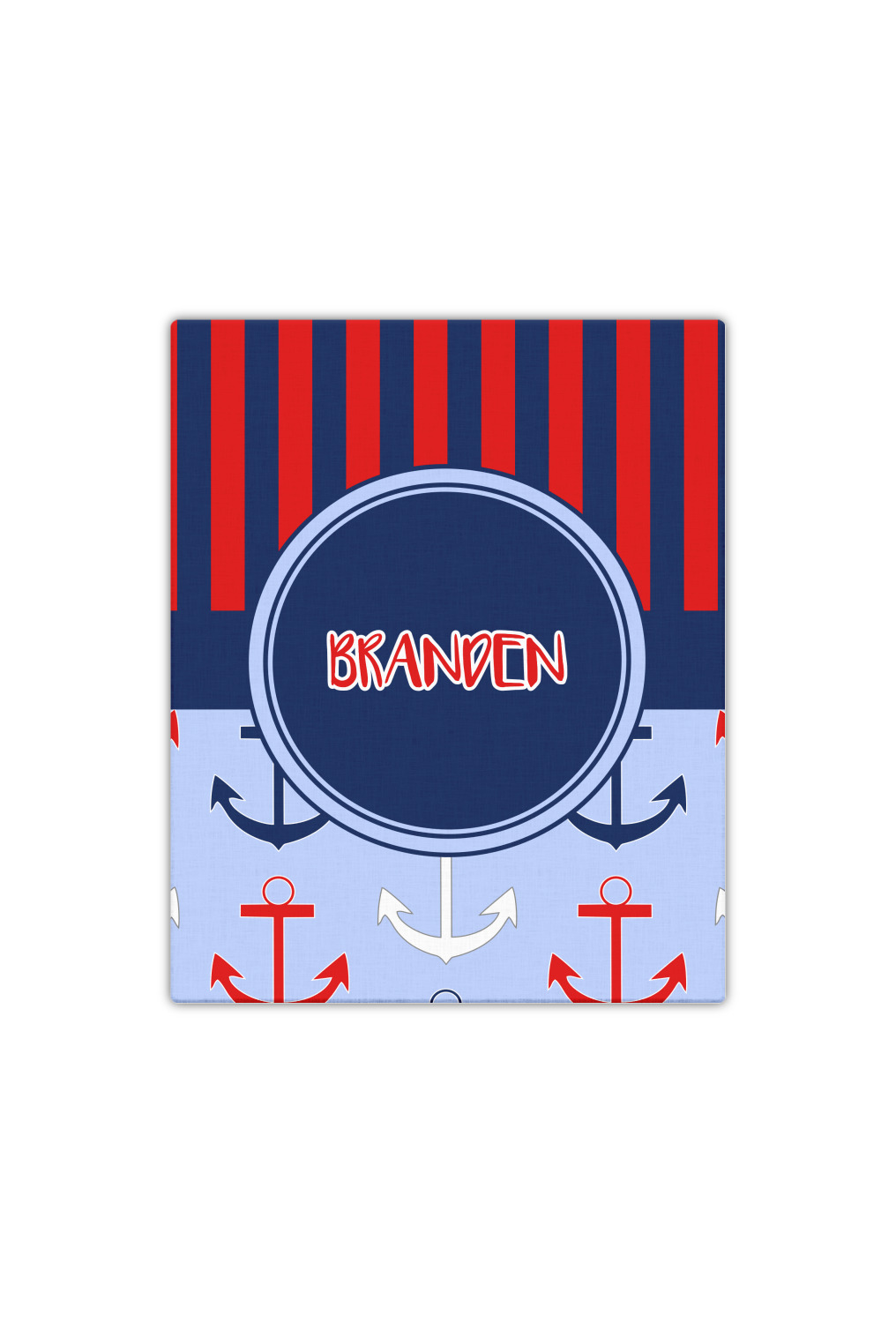 This anchor & stripes pattern is a classic nautical including the colors. We chose the classic nautical red and navy blue striped on top, with anchors in red, white and blue on the bottom. We chose a solid navy ribbon along with a circle label and personalized it with a name.