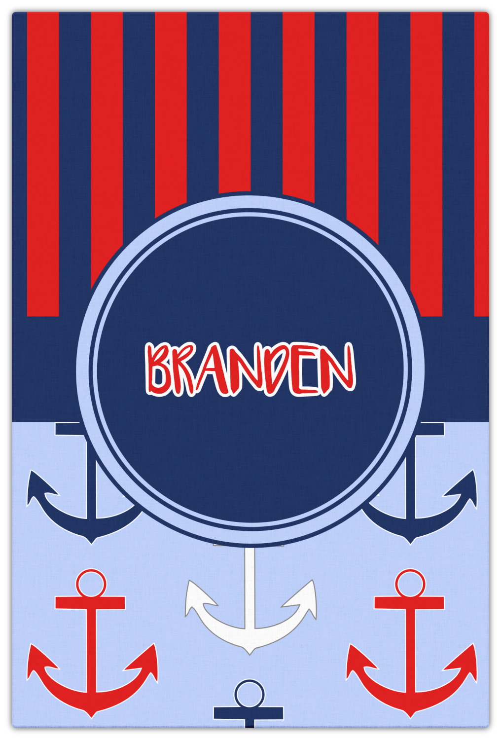 This anchor & stripes pattern is a classic nautical including the colors. We chose the classic nautical red and navy blue striped on top, with anchors in red, white and blue on the bottom. We chose a solid navy ribbon along with a circle label and personalized it with a name.