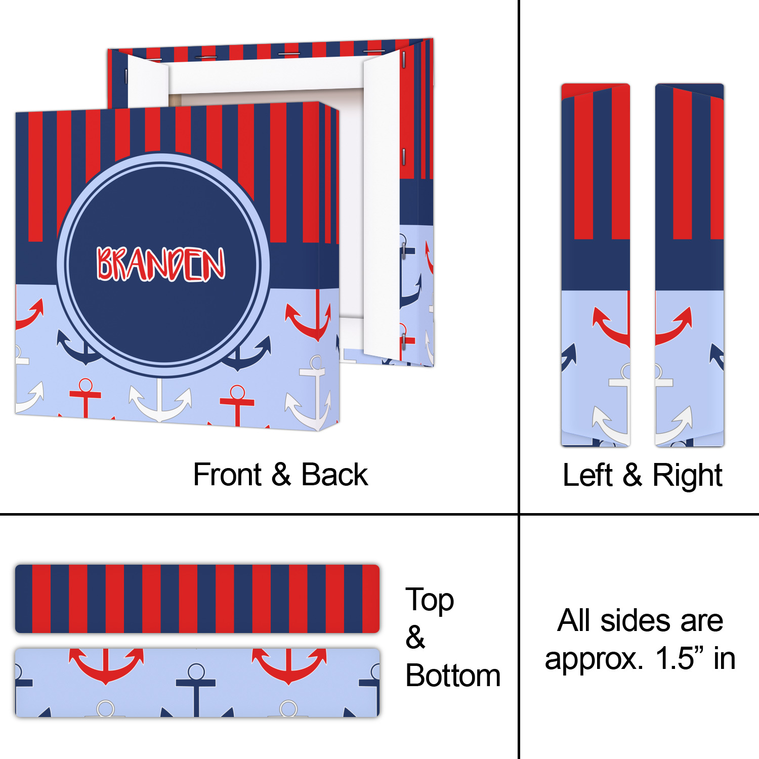 This anchor & stripes pattern is a classic nautical including the colors. We chose the classic nautical red and navy blue striped on top, with anchors in red, white and blue on the bottom. We chose a solid navy ribbon along with a circle label and personalized it with a name.