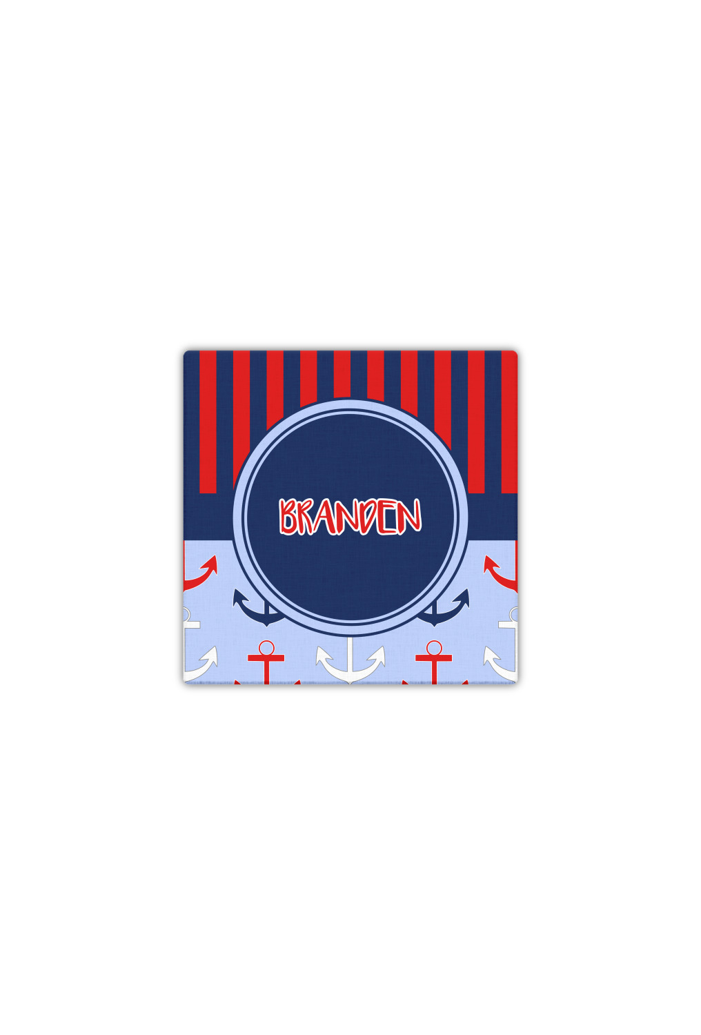 This anchor & stripes pattern is a classic nautical including the colors. We chose the classic nautical red and navy blue striped on top, with anchors in red, white and blue on the bottom. We chose a solid navy ribbon along with a circle label and personalized it with a name.