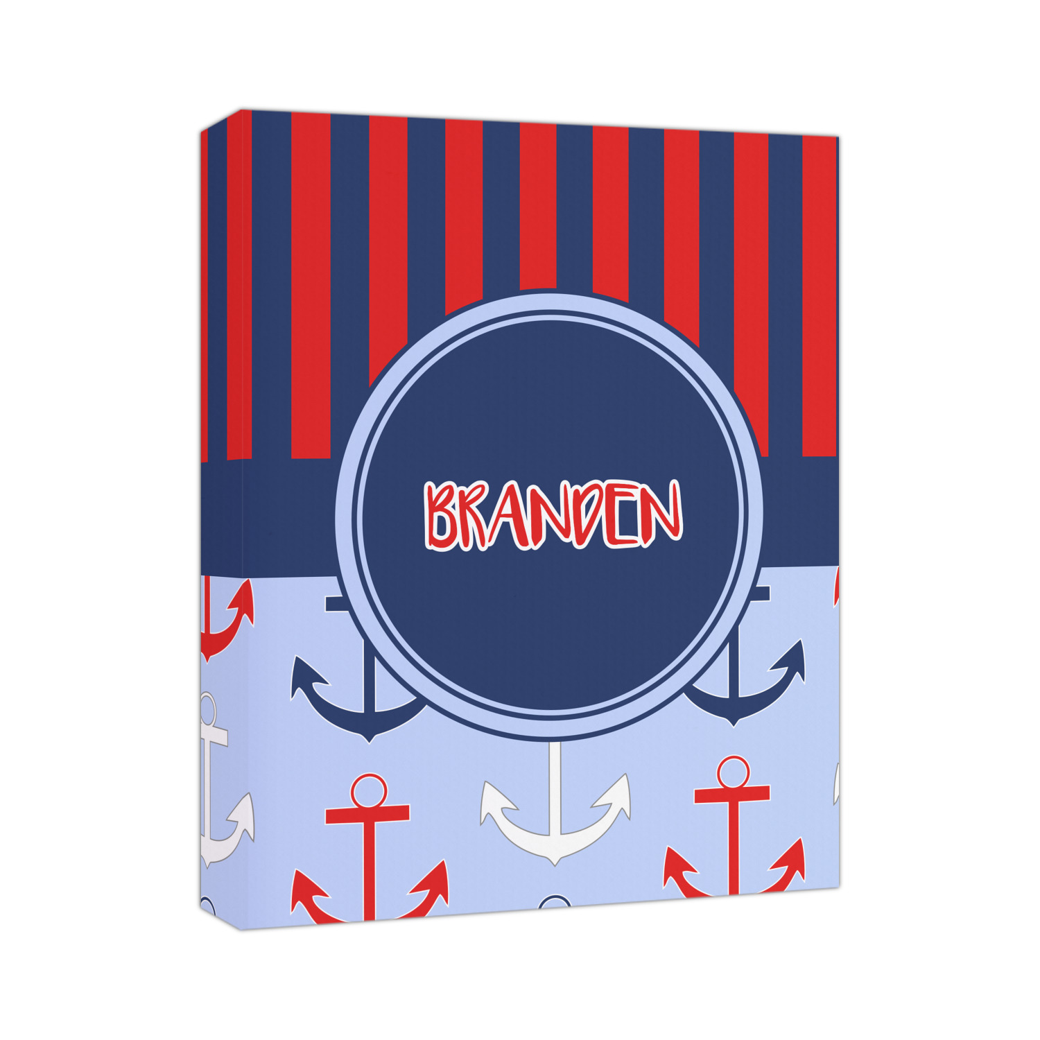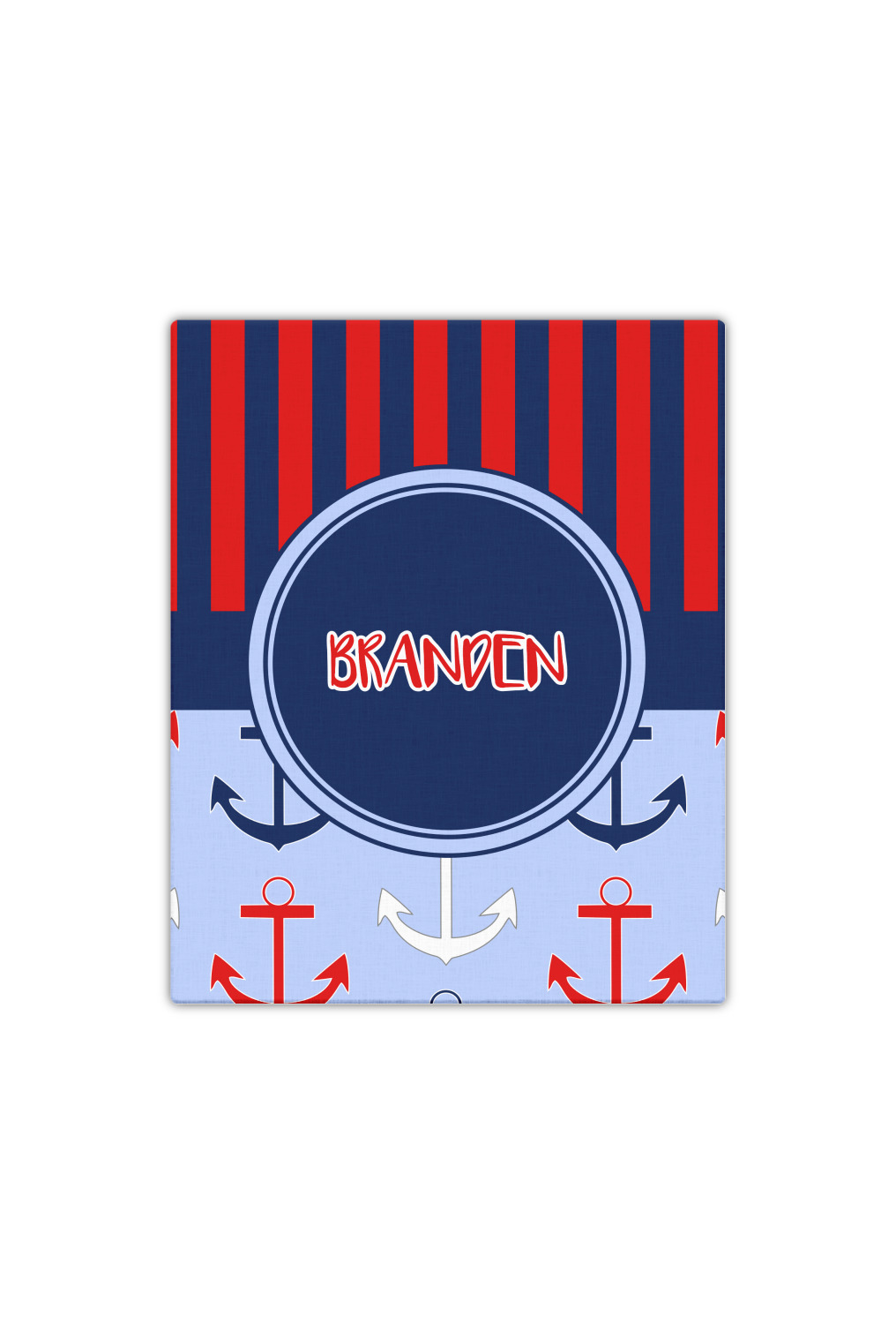 This anchor & stripes pattern is a classic nautical including the colors. We chose the classic nautical red and navy blue striped on top, with anchors in red, white and blue on the bottom. We chose a solid navy ribbon along with a circle label and personalized it with a name.