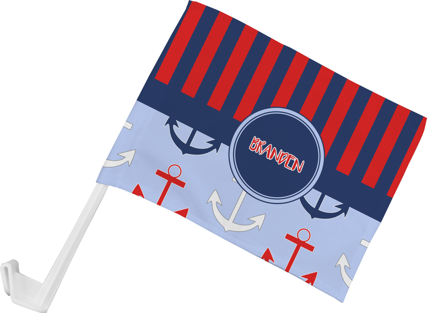 Our personalized flags are made from a durable, yet lightweight cloth that will proudly bear your logo or design of choice, while withstanding the outside elements. We have two size options - 8" x 11" and 11" x 15". Both come with a flag pole which includes a clip that secures the pole to the side window, whether it is rolled up or down. The flags are printed on both sides to display your design from all directions.