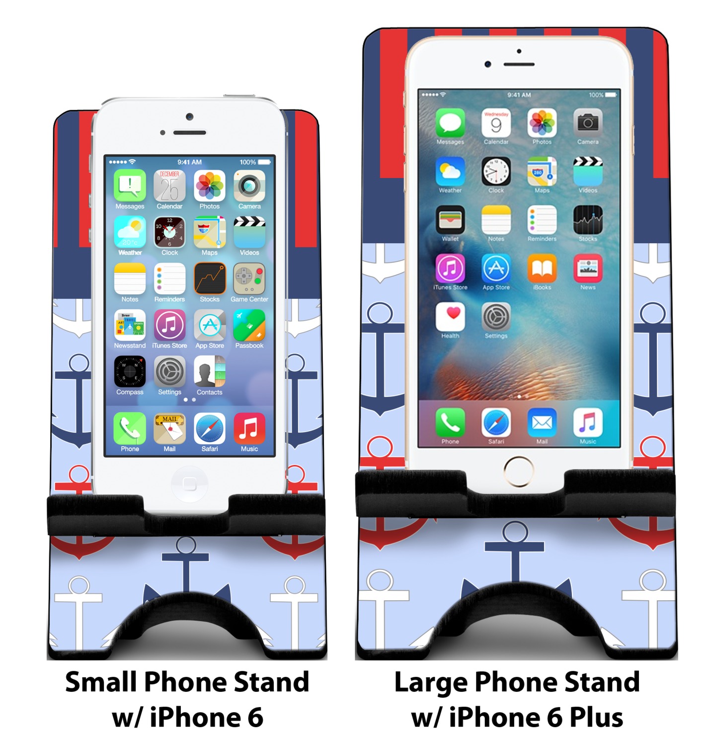 To meet your needs, we offer four variations of this IPhone stand. The backboard of the first version is shaped as a plain, yet sleek rectangle, and is available in two sizes. Our smaller size is approximately 4 by 3.25 by 7 inches, while the larger model is 4 by 3.77 by 8.5 inches. Alongside this model, we also provide you with a more decorative option. The upper part of our second version features a curved edge, for a classy, suave appearance. This phone holder is also sold in two sizes: a smaller version, which is 4 by 3.25 by 7 inches, and our larger model, which is 4 by 3.77 by 8.5 inches. Both models will support large phones, but the larger model is better if you wish to proudly display your personalized design.