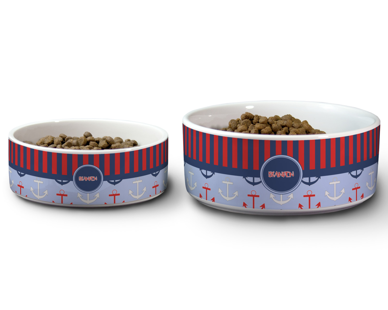 We carry these custom dog bowls in two available sizes: medium and large.The medium is 6 inches in diameter and 2.5 inches tall, and can therefore suit pets who eat up to 2.5 cups of food per meal. The large pet bowl is 7 inches in diameter and 3 inches tall, and suits pets who require up to 4.5 cups of food per meal.
