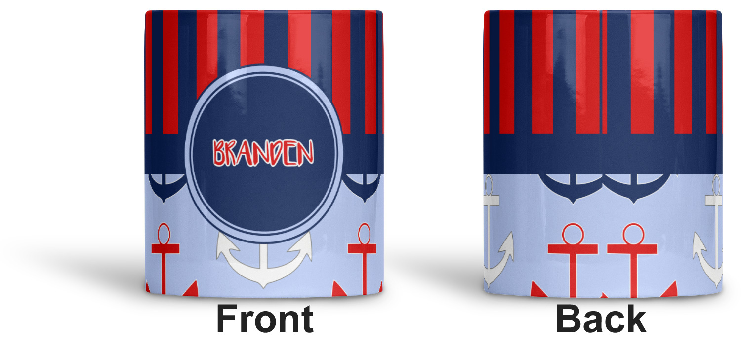 This anchor & stripes pattern is a classic nautical including the colors. We chose the classic nautical red and navy blue striped on top, with anchors in red, white and blue on the bottom. We chose a solid navy ribbon along with a circle label and personalized it with a name.