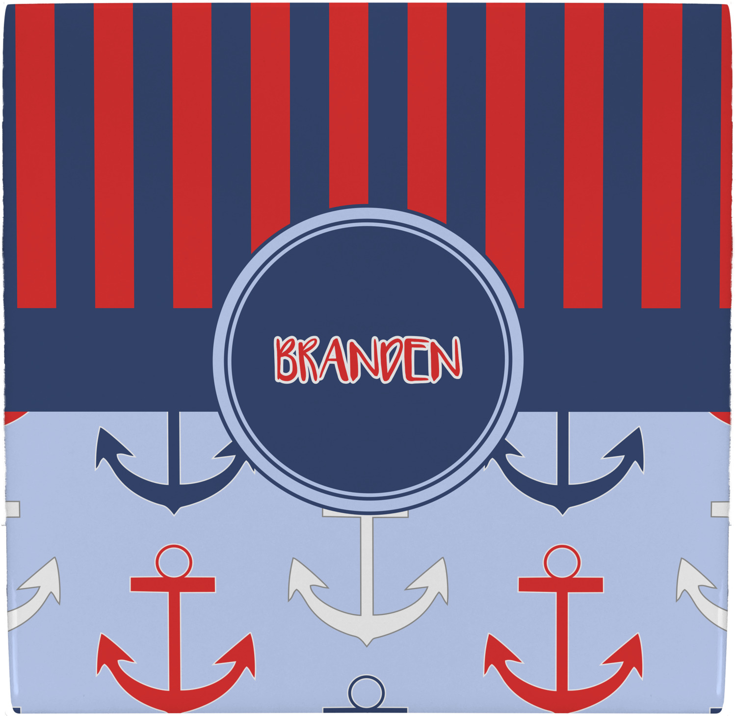This anchor & stripes pattern is a classic nautical including the colors. We chose the classic nautical red and navy blue striped on top, with anchors in red, white and blue on the bottom. We chose a solid navy ribbon along with a circle label and personalized it with a name.