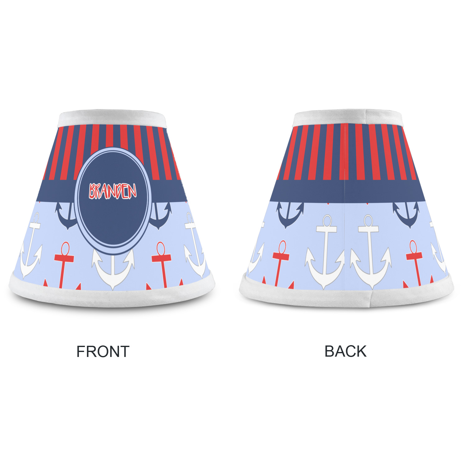 This anchor & stripes pattern is a classic nautical including the colors. We chose the classic nautical red and navy blue striped on top, with anchors in red, white and blue on the bottom. We chose a solid navy ribbon along with a circle label and personalized it with a name.