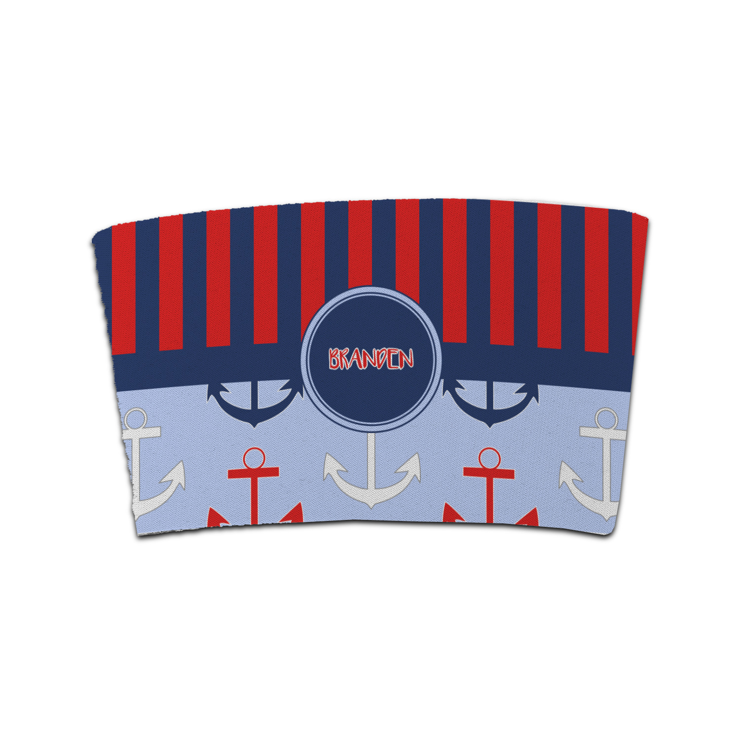 This anchor & stripes pattern is a classic nautical including the colors. We chose the classic nautical red and navy blue striped on top, with anchors in red, white and blue on the bottom. We chose a solid navy ribbon along with a circle label and personalized it with a name.