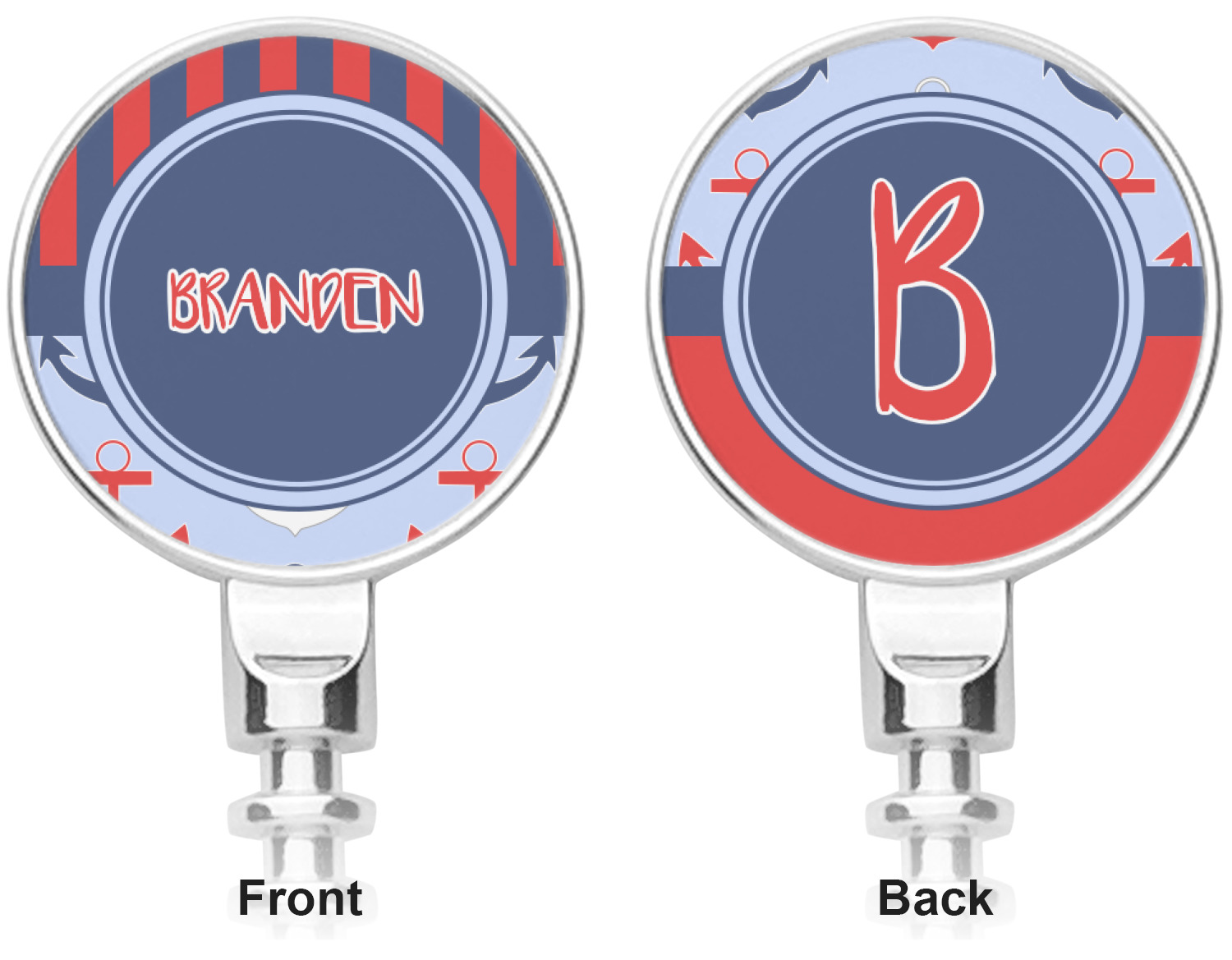 This anchor & stripes pattern is a classic nautical including the colors. We chose the classic nautical red and navy blue striped on top, with anchors in red, white and blue on the bottom. We chose a solid navy ribbon along with a circle label and personalized it with a name.