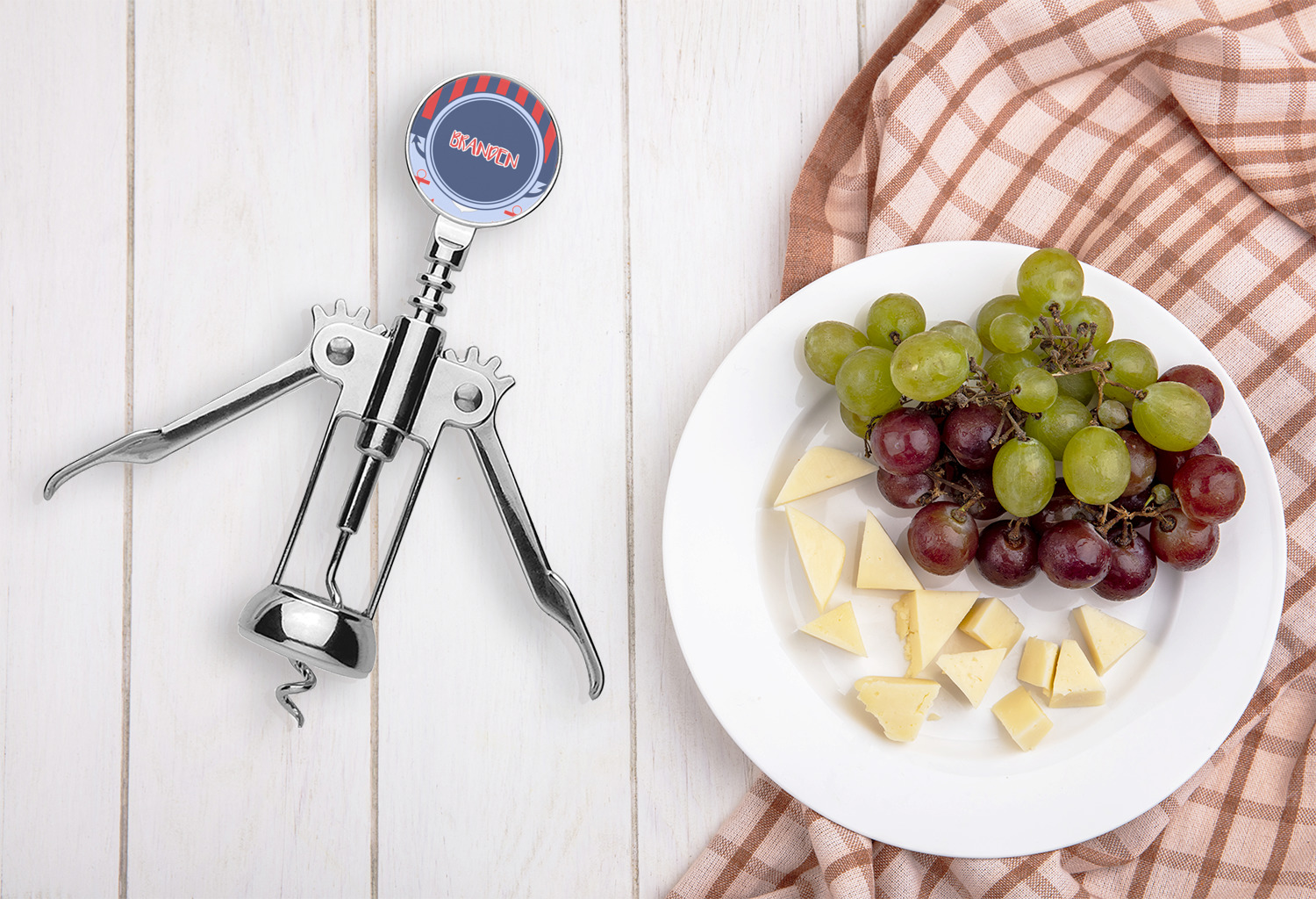 Built from a robust stainless steel, this wine bottle opener features winged grippers that let you remove the cork with little to no resistance. Your personalized corkscrew also includes a circular turn-handle at its top. At 7 inches long, you can easily store this wine corkscrew in a drawer or a shelf. Your customization is printed on both sides of the turn-handle, and can be customized individually.