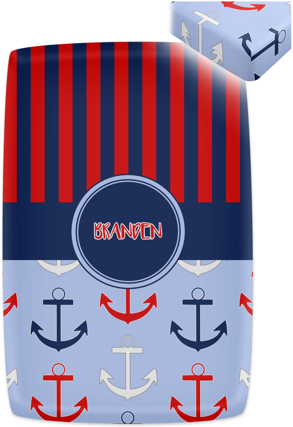 This anchor & stripes pattern is a classic nautical including the colors. We chose the classic nautical red and navy blue striped on top, with anchors in red, white and blue on the bottom. We chose a solid navy ribbon along with a circle label and personalized it with a name.