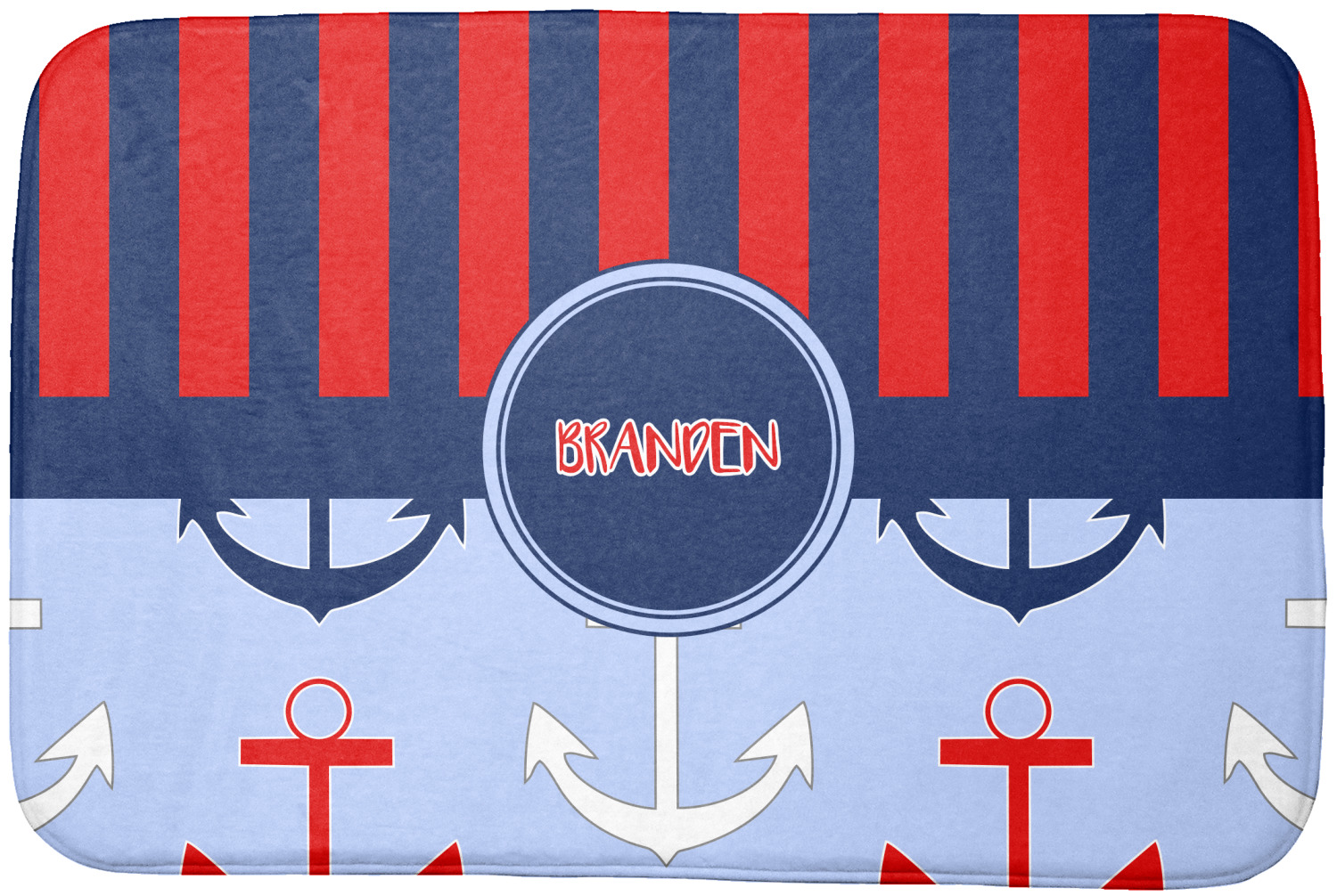 This anchor & stripes pattern is a classic nautical including the colors. We chose the classic nautical red and navy blue striped on top, with anchors in red, white and blue on the bottom. We chose a solid navy ribbon along with a circle label and personalized it with a name.