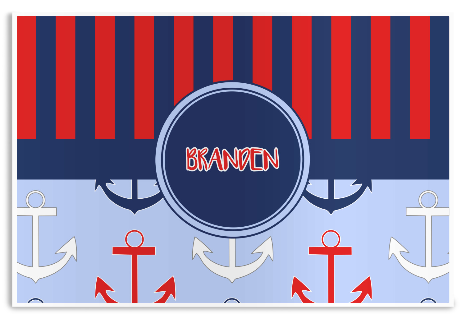 This anchor & stripes pattern is a classic nautical including the colors. We chose the classic nautical red and navy blue striped on top, with anchors in red, white and blue on the bottom. We chose a solid navy ribbon along with a circle label and personalized it with a name.