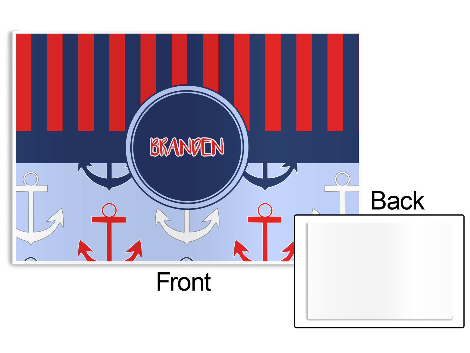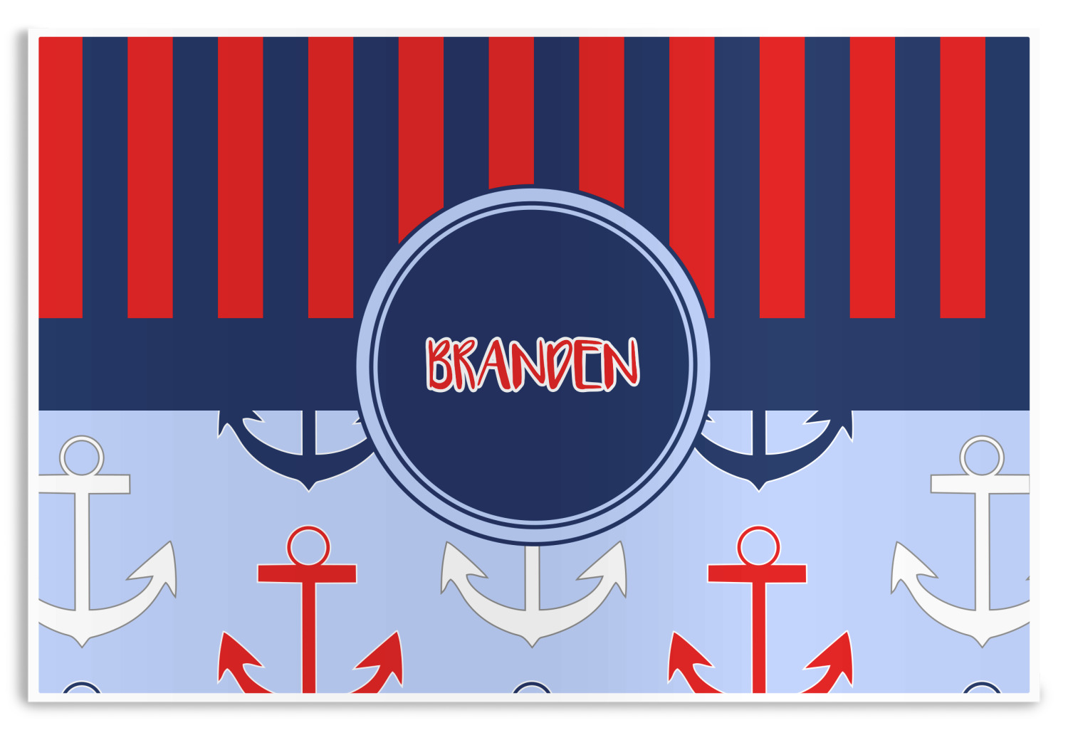 This anchor & stripes pattern is a classic nautical including the colors. We chose the classic nautical red and navy blue striped on top, with anchors in red, white and blue on the bottom. We chose a solid navy ribbon along with a circle label and personalized it with a name.