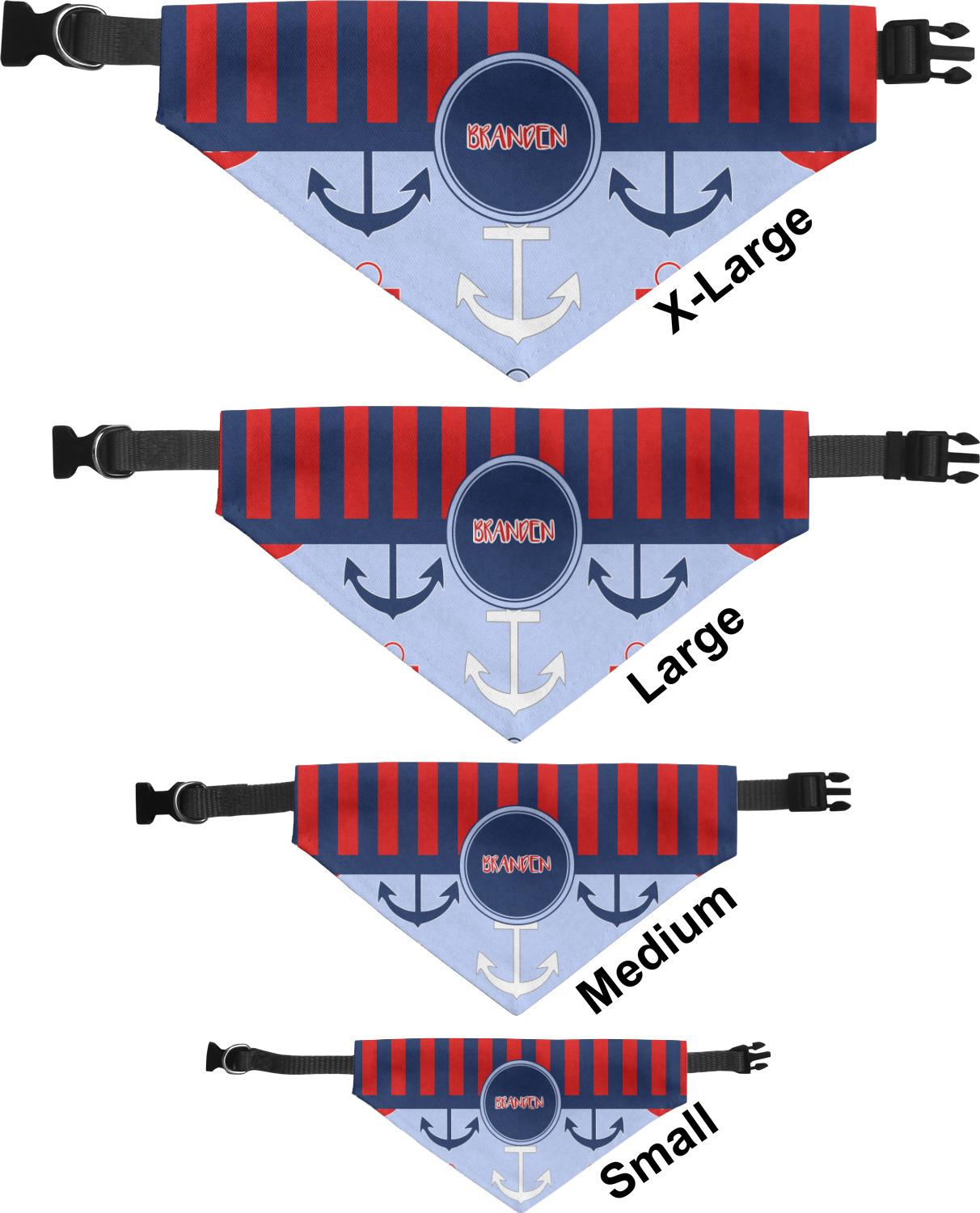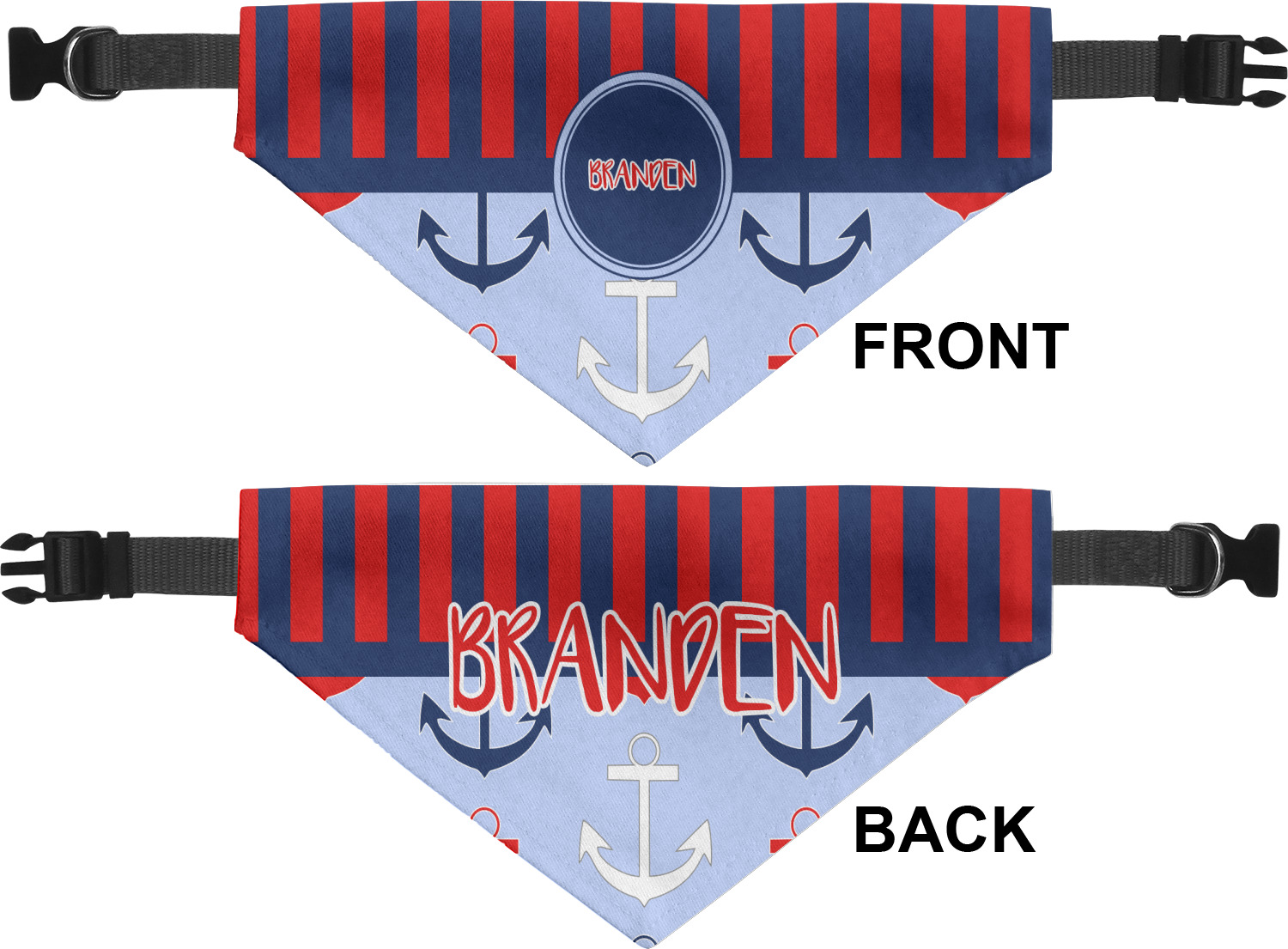 We print the front and back of these dog bandanas with your customized design. The bandana itself is made from a durable polyester, sewn together with a gap large enough to accommodate any collar. Regardless, the bandana includes a plain black, canvas collar with plastic snaps, that can easily be removed if desired. These dog bandana collars are available in four sizes: small, medium, large, and extra large. Please see our sizing chart for more information regarding the dimensions of each size.