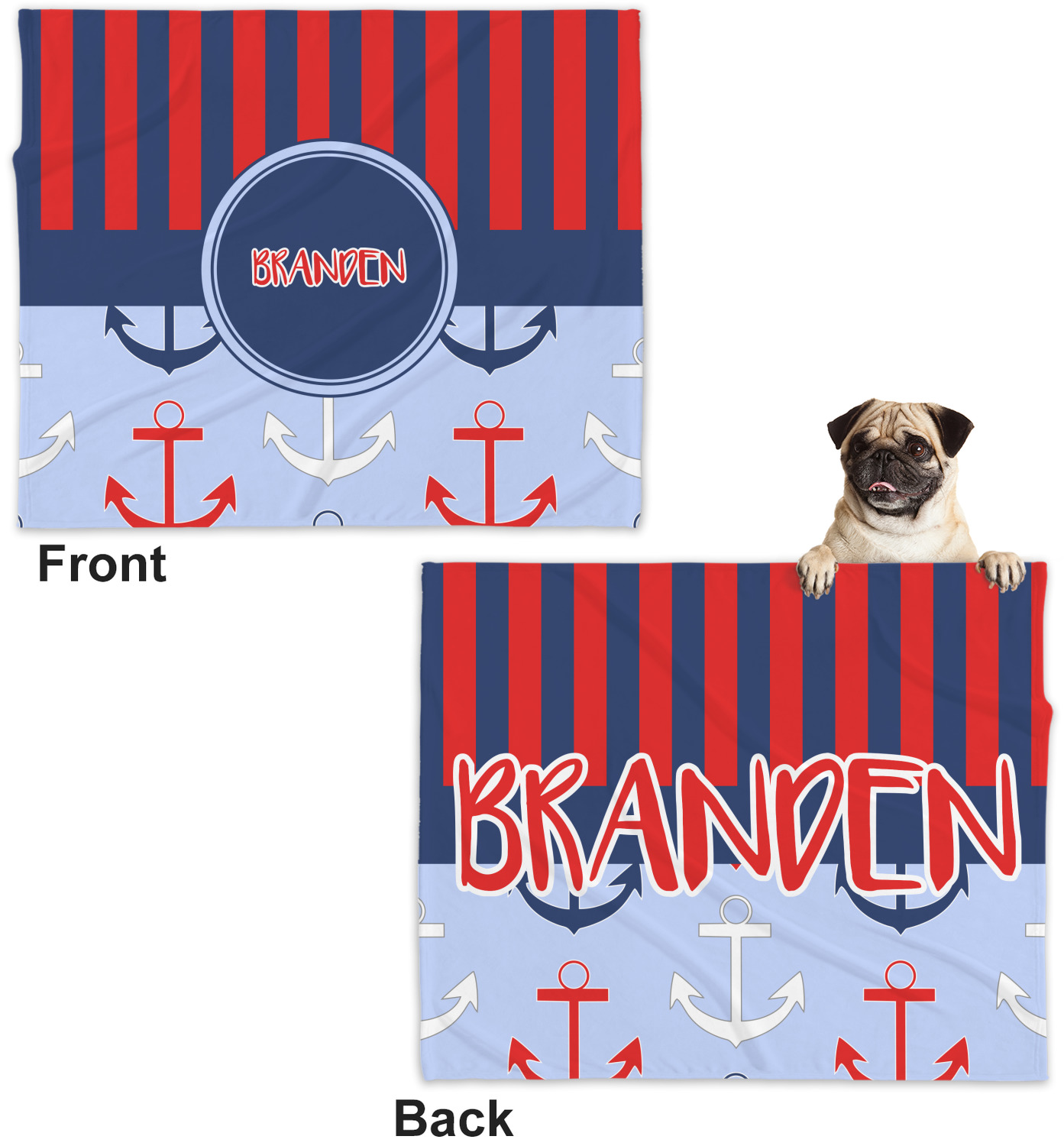 These dog blankets are crafted from a gentle, soft-to-the-touch, minky material. We print your customizations, either matching or differing, on both the top and underside of the blanket. These personalized dog blankets are available in two sizes: regular and large. Our regular size, at 40" x 30", accommodates small and some medium size dogs. At 60" x 50", our large dog blanket is a better fit for bigger breeds. Though specialized for dogs, these blankets still make a thoughtful gift for your favorite feline, or any other pet in mind!