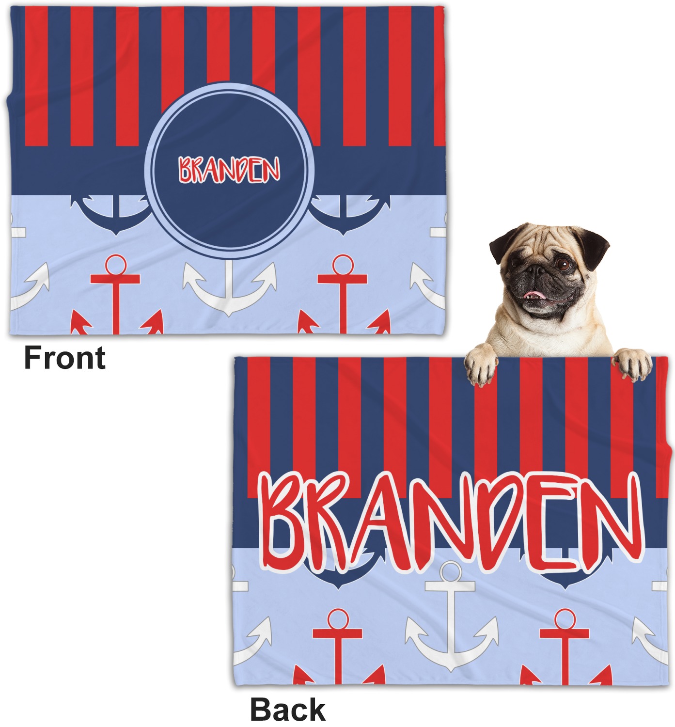 These dog blankets are crafted from a gentle, soft-to-the-touch, minky material. We print your customizations, either matching or differing, on both the top and underside of the blanket. These personalized dog blankets are available in two sizes: regular and large. Our regular size, at 40" x 30", accommodates small and some medium size dogs. At 60" x 50", our large dog blanket is a better fit for bigger breeds. Though specialized for dogs, these blankets still make a thoughtful gift for your favorite feline, or any other pet in mind!
