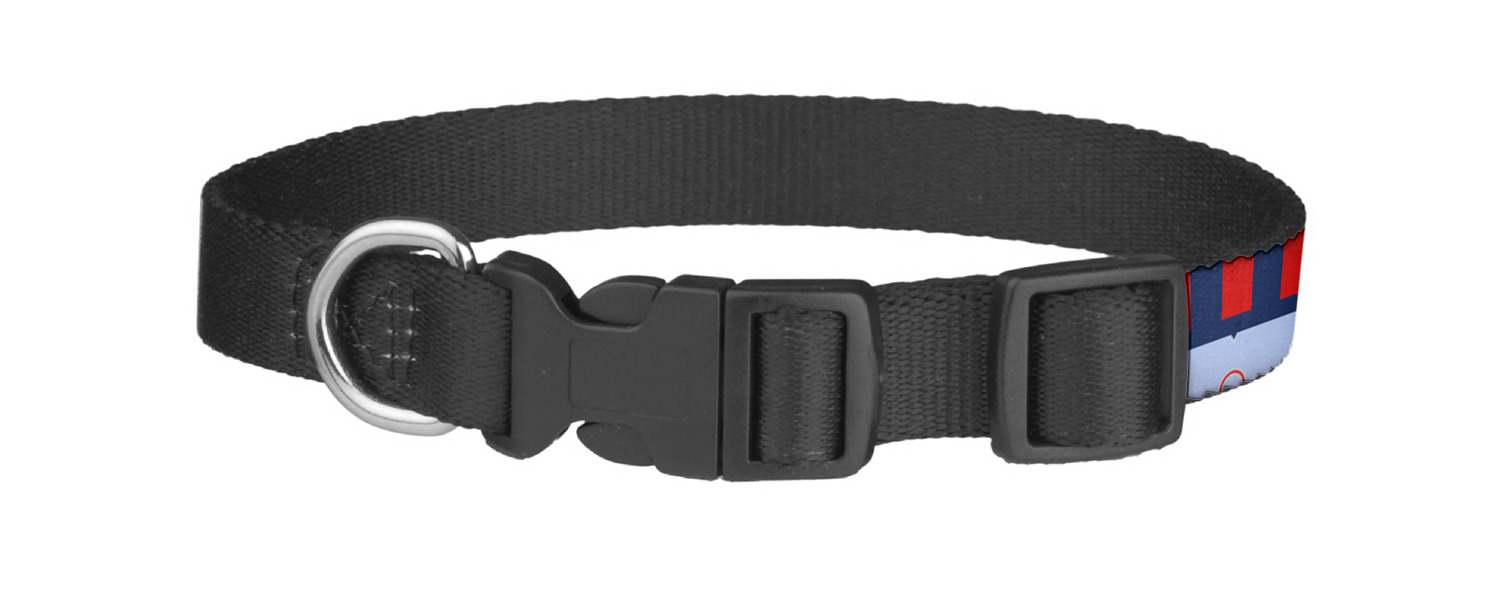 This sturdy collar, made from a durable nylon weave, will outlive your dog's episodes of excited tugging and pulling. Courtesy of its thick plastic buckle and adjuster, this collar is adjustable and accommodating of any dog. Structurally, the collar is a single piece of nylon weave that is sewn together, and features a solid metal loop where you can attach a leash or dog tag. We print and display your dog's name and pattern across the middle of the personalized dog collar.