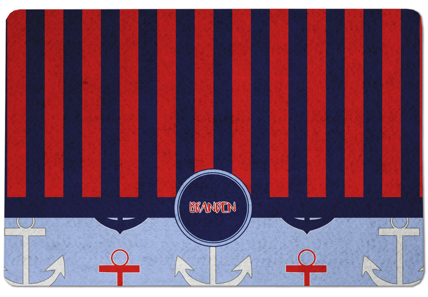 This anchor & stripes pattern is a classic nautical including the colors. We chose the classic nautical red and navy blue striped on top, with anchors in red, white and blue on the bottom. We chose a solid navy ribbon along with a circle label and personalized it with a name.