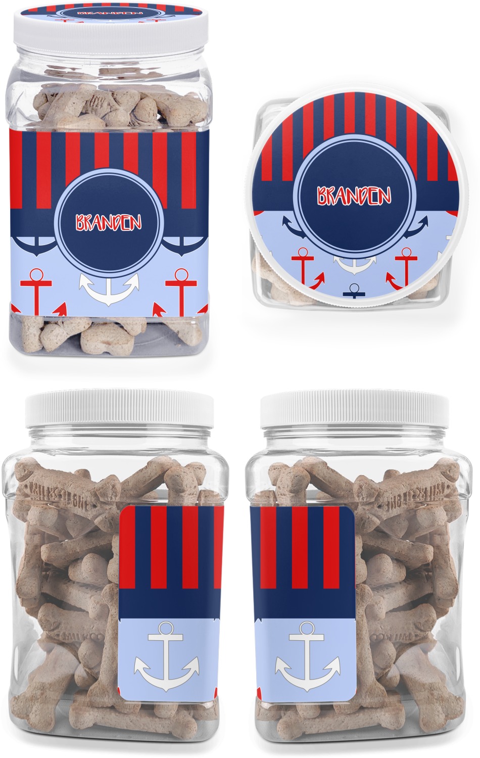 This half gallon jar, made from a sturdy plastic, is the perfect way to keep treats from any naughty pet paws, while still keeping them ready on hand for when your pup performs an impressive trick. This dog cookie jar features a screw-on, white lid that displays your personalized design on a vinyl sticker. We apply another customized sticker that wraps around the front and sides of the jar. Our dog treat jar also has indentations on the rear ends of the sides, which allows for convenient handling, and its square frame allows for easy storage.