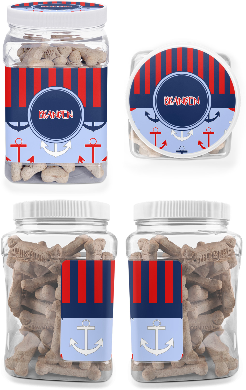 This half gallon jar, made from a sturdy plastic, is the perfect way to keep treats from any naughty pet paws, while still keeping them ready on hand for when your pup performs an impressive trick. This dog cookie jar features a screw-on, white lid that displays your personalized design on a vinyl sticker. We apply another customized sticker that wraps around the front and sides of the jar. Our dog treat jar also has indentations on the rear ends of the sides, which allows for convenient handling, and its square frame allows for easy storage.